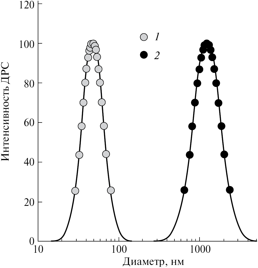 Рис. 3. Распределение частиц/агрегатов в суспензии наночастиц маггемита, стабилизированных цитратом натрия. 1 – в воде; 2 – в питательной среде DMEM.