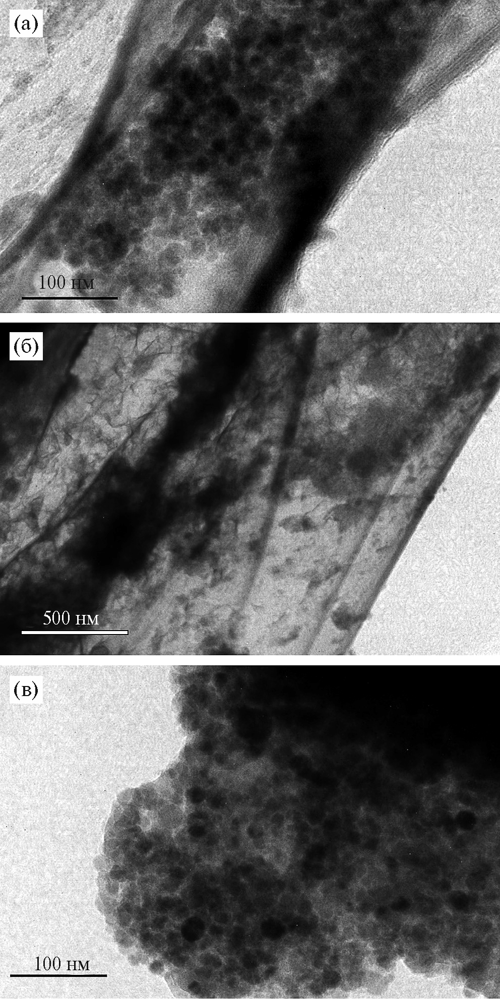 На рис. 7 приведены типичные электронные микрофотографии МСК-содержащих МНЧ. В первую очередь следует отметить, что во всех случаях в образце, прошедшем процедуру отмывки, наблюдается большое количество МНЧ. Хотя по 2D-данным ПЭМ для изображений клеток, содержащих МНЧ (рис. 6а, б), невозможно установить интернализированы или нет оставшиеся после процесса отмывания наночастицы, полученные результаты не исключают такую возможность. Ранее было отмечено, что синтезированная в данной работе суспензия ЛИМ МНЧ достаточно похожа на суспензию, использованную в исследовании [9], где агрегаты МНЧ отмечались внутри эндосом, контурировали гидролитические везикулы/секреторные гранулы и внешнюю мембрану митохондрий, и лишь единичные включения свободно располагались в цитоплазме клеток. Так или иначе, данные ПЭМ (без окраски органелл) подтверждают тот факт, что МСК после добавления МНЧ в ростовую среду интенсивно их аккумулируют, что, в свою очередь, указывает на некую форму взаимодействия между МНЧ и МСК.