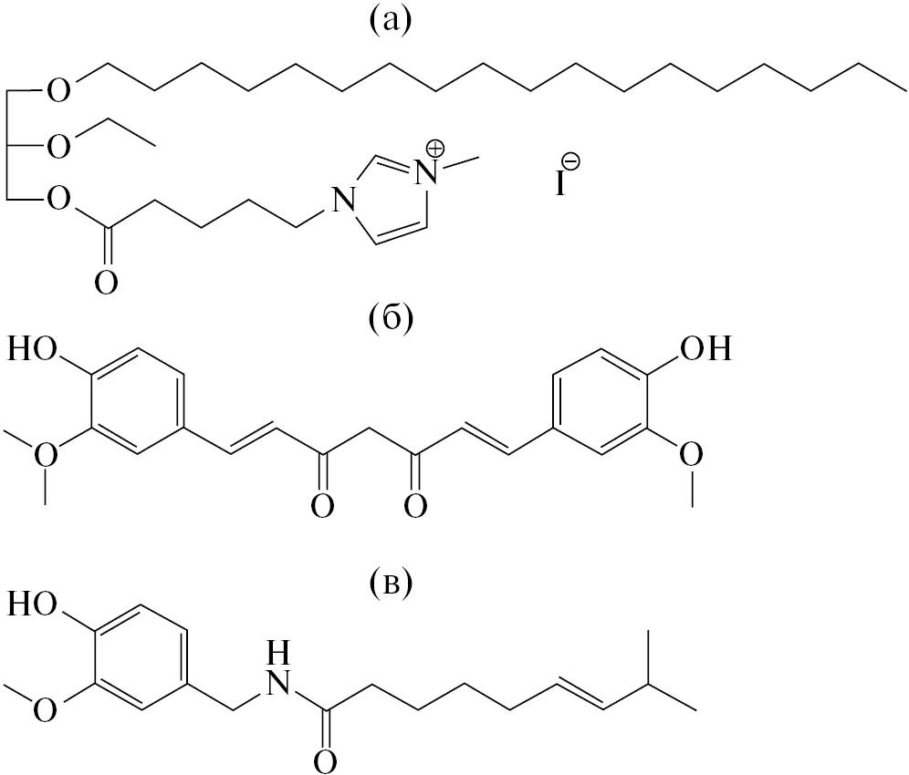 Рис. 1. Структурные формулы катионного глицеролипида (a), куркумина (б) и капсаицина (в).