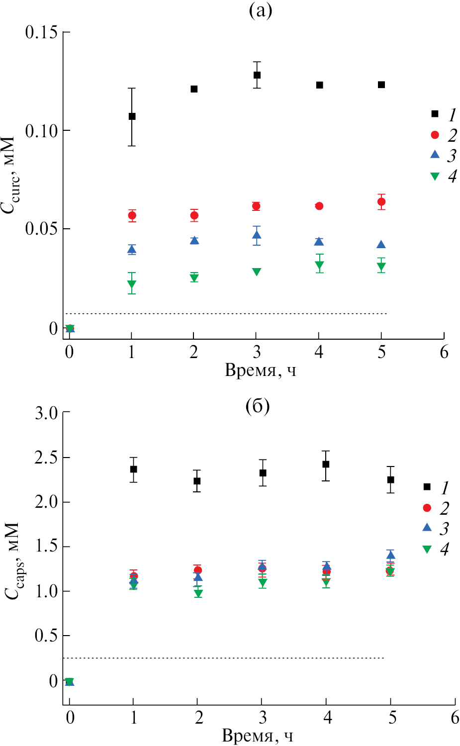 Рис. 3. Кинетические кривые солюбилизации куркумина (а) и капсаицина (б) в водных растворах КГЛ с концентрацией 1.5 (1), 0.15 (2), 0.075 (3) и 0.03 мМ (4). Пунктиром показана равновесная растворимость обоих гидрофобных соединений в воде.