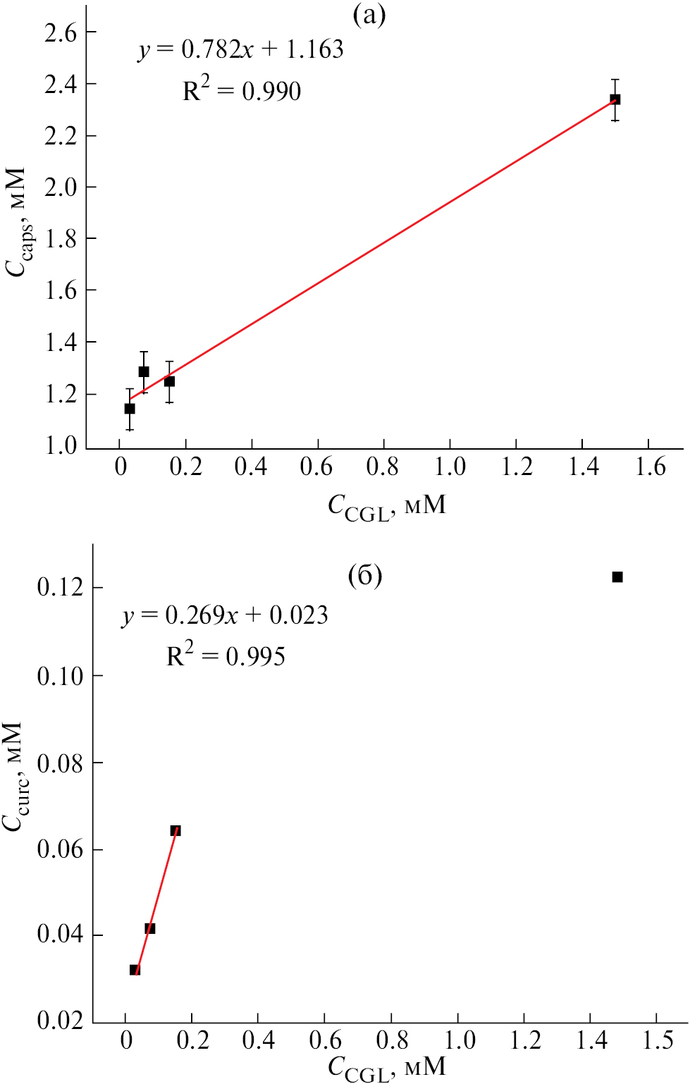 Изотермы солюбилизации куркумина и капсаицина в ассоциатах КГЛ приведены на рис. 4. В случае капсаицина изотерма линейна во всем исследованном диапазоне концентраций КГЛ (рис. 4а). Согласно [34], это указывает на неизменность формы ассоциатов глицеролипида. В свою очередь, для куркумина линеен лишь начальный участок изотермы (рис. 4б). В случае же сравнительно концентрированных растворов КГЛ (1.5 мМ или 75 ККА) солюбилизация куркумина, по-видимому, сопровождается изменением формы ассоциатов. Это может быть следствием взаимодействия катионов КГЛ с депротонированными молекулами куркумина.