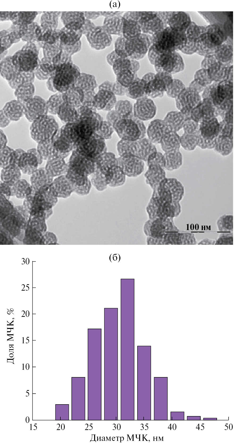 Завершающим этапом работы явилось изучение возможности сборки бифункциональных МЧК на темплатах из ассоциатов КГЛ с солюбилизированным в них куркумином (КГЛ-курк) или капсаицином (КГЛ-капс). Согласно данным ПЭМВР, использованный нами протокол позволил получить на темплатах обоих типов сферические МЧК с узким распределением по размеру. Пористая структура таких частиц полностью идентична наблюдавшейся для МЧК, полученных в аналогичных условиях на «пустых» ассоциатах КГЛ [33], и не зависит от молекулярной структуры использованного гидрофобного солюбилизата. Средний диаметр МЧК, синтезированных на темплатах КГЛ-курк и КГЛ-капс, составил примерно 40 и 30 нм соответственно. В качестве примера на рис. 5 приведена микрофотография МЧК, полученных на темплате КГЛ-капс.