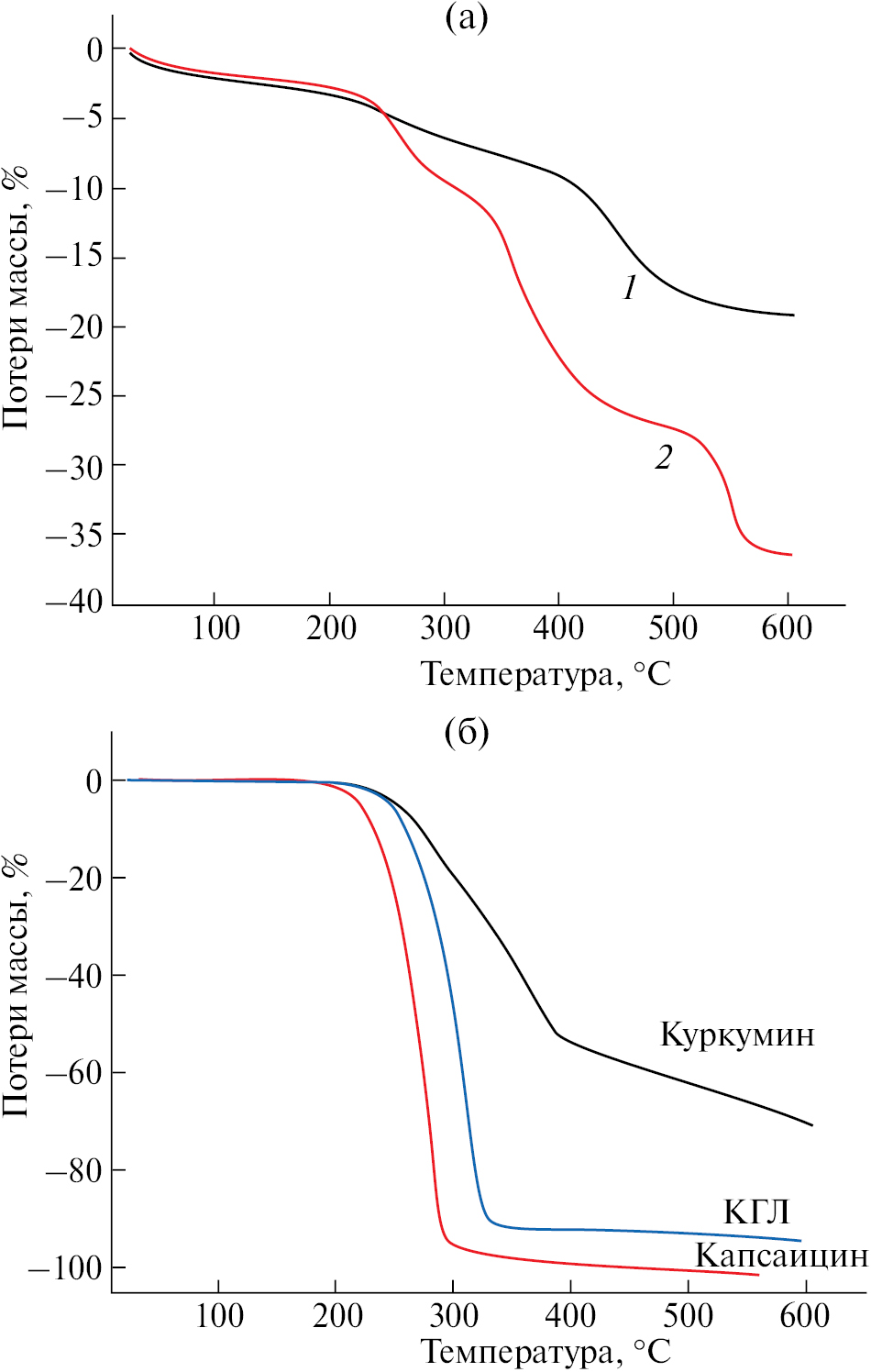 На рис. 7 приведены ТГА-кривые для обоих типов МЧК и использованных при их синтезе биологически активных соединений. Прежде всего обращает на себя внимание тот факт, что характер термодеструкции исходных и капсулированных в кремнеземной матрице соединений сильно различается. Такая картина достаточно типична и наблюдается при синтезе МЧК как на инертных, так и на функциональных темплатах (см., например, работы [24, 42] и приведенные в них ссылки). Отметим, что форма ТГА-кривой для МЧК, полученных на темплате КГЛ-курк (кривая 1 на рис. 7), полностью идентична зарегистрированной для МЧК, синтезированных на «пустых» ассоциатах КГЛ [33]. Очевидно, в данном случае основной вклад в потерю массы частицами вносит именно глицеролипид, что неудивительно, поскольку массовое соотношение КГЛ : куркумин в бифункциональном темплате составляет примерно 5.4 : 1. Несмотря на то, что в данном случае в МЧК загружены два препарата, потери массы таким образцом в температурном диапазоне их термодеструкции (200–500оC) относительно невелики. Они составляют около 15 масс. % (или 0.18 г в расчете на 1 г SiO2), что даже несколько меньше, чем для МЧК, не содержащих куркумина [33]. На наш взгляд, такой результат обусловлен особенностями термодеструкции темплатирующих соединений (в первую очередь куркумина). В этой связи напомним, что ТГА проводили в атмосфере аргона. В этом случае в процессе нагрева образца может иметь место карбонизация органических соединений и, как следствие, уменьшение потерь массы. Как следует из анализа ТГА-кривых, представленных на рис. 7, для куркумина этот эффект выражен достаточно сильно, что и приводит к не вполне корректному определению емкости МЧК.