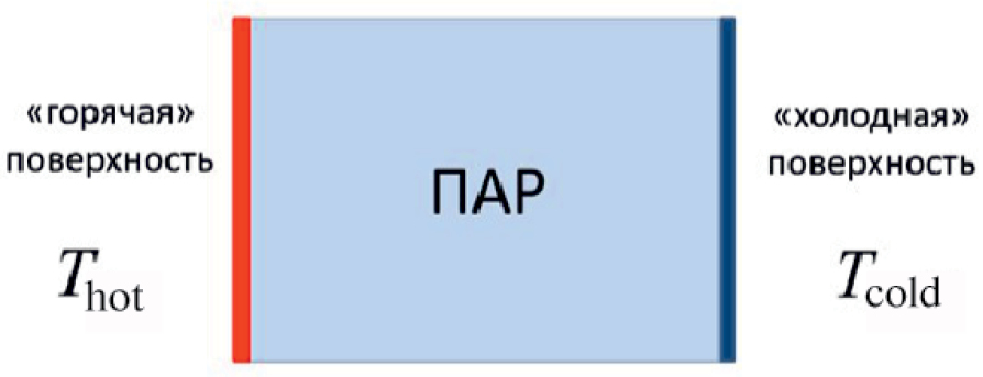 Рассматривалась следующая постановка задачи. Область, занятая паром, ограничена двумя бесконечными плоскими поверхностями, на которых возможны процессы испарения и конденсации. До начала рассматриваемого процесса температуры поверхностей одинаковы и равны заданной величине Тcold, пар находится в состоянии насыщения при этой температуре. В начальный момент времени температура «горячей» поверхности мгновенно увеличивается до заданного значения Тhot, и на этой поверхности начинается испарение. В дальнейшем температура поверхности поддерживается постоянной. Расчет прекращался после того, как вызванное испарением возмущение в паре доходит до «холодной» межфазной поверхности. В принятой постановке движение межфазных поверхностей и возможные отклонения их формы от плоскости не учитывались.