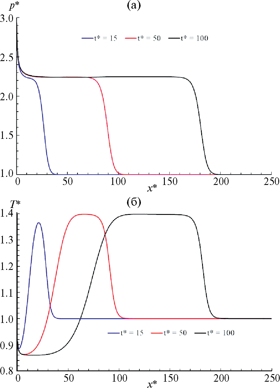 Расчеты проводились для воды, метанола, этанола, азота и аргона, отношение температур «горячей» и «холодной» поверхностей Тhot/Тcold варьировалось от 1.02 до 1.5. Следует отметить, что учет внутренних степеней свободы молекул существенно усложняет расчет интеграла столкновений в уравнении Больцмана, поэтому внутренние степени свободы не учитывались в расчетах, так что полученные результаты расчетов для всех веществ, кроме аргона, который является одноатомным газом, являются приближенными. Результаты расчетов для различных веществ и различных параметров расчета качественно не отличаются. В качестве примера на рис. 2 представлены результаты расчетов для воды при температурах «горячей» и «холодной» поверхности 300.465 К и 273.15 К соответственно. Показаны зависимости давления и температуры от координаты в различные моменты времени в безразмерном виде. Безразмерные параметры определяются следующим образом: