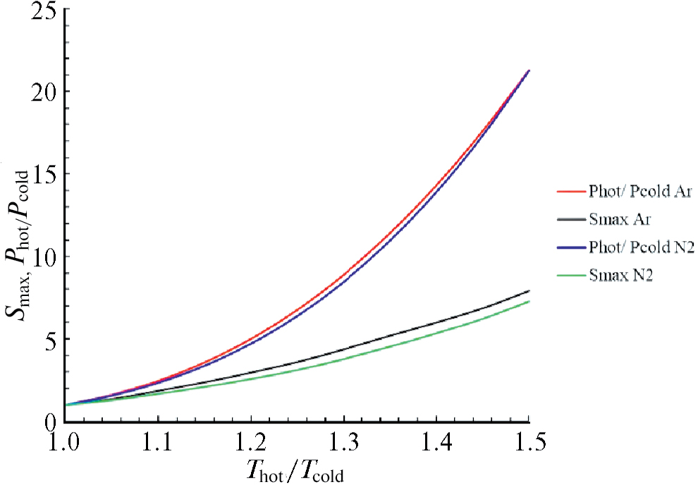 Широкий диапазон исходных данных рассматривался для того, чтобы подтвердить или опровергнуть сделанный на основании первых расчетов вывод, что максимум степени пересыщения достаточно близок к отношению давлений насыщения при температурах Тhot и Тcold. Проведенные расчеты показали, что этот вывод является корректным только для некоторых веществ при малом значении Тhot/Тcold. Пример зависимости максимальной степени пересыщения и отношения давлений от величины Тhot/Тcold для аргона и азота показан на рис. 3.