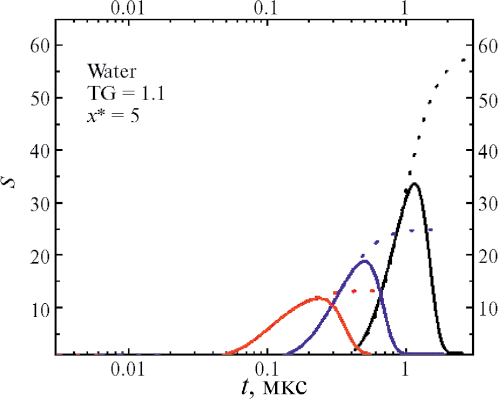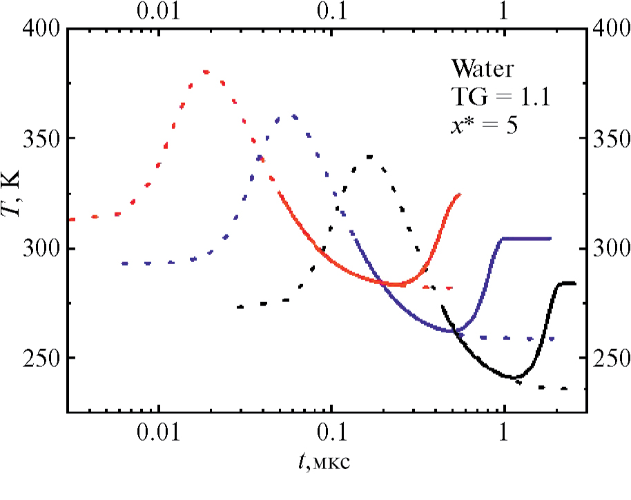 На рис. 5 показаны зависимости температуры и степени пересыщения от времени при x* = 5 для воды при различных начальных температурах и Тhot/ Тcold = 1.1. Видно, что с понижением начальной температуры степень пересыщения пара увеличивается. Вместе с очевидным выводом о росте степени пересыщения с увеличением значения Тhot/Тcold это позволяет сделать следующий вывод: для каждой начальной температуры существует минимальное значение Тhot/Тcold, которое обеспечивает пересыщение, достаточное для интенсивного образования зародышей.