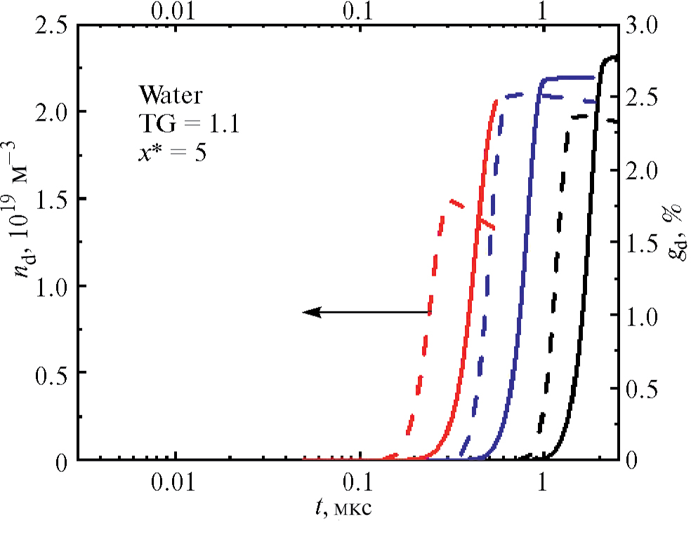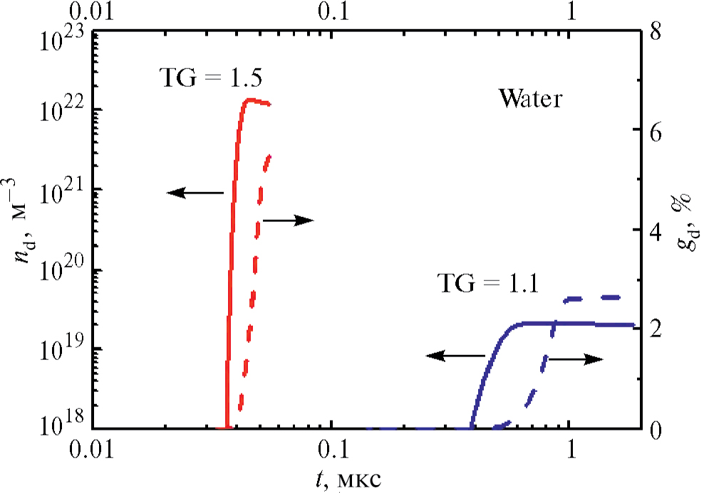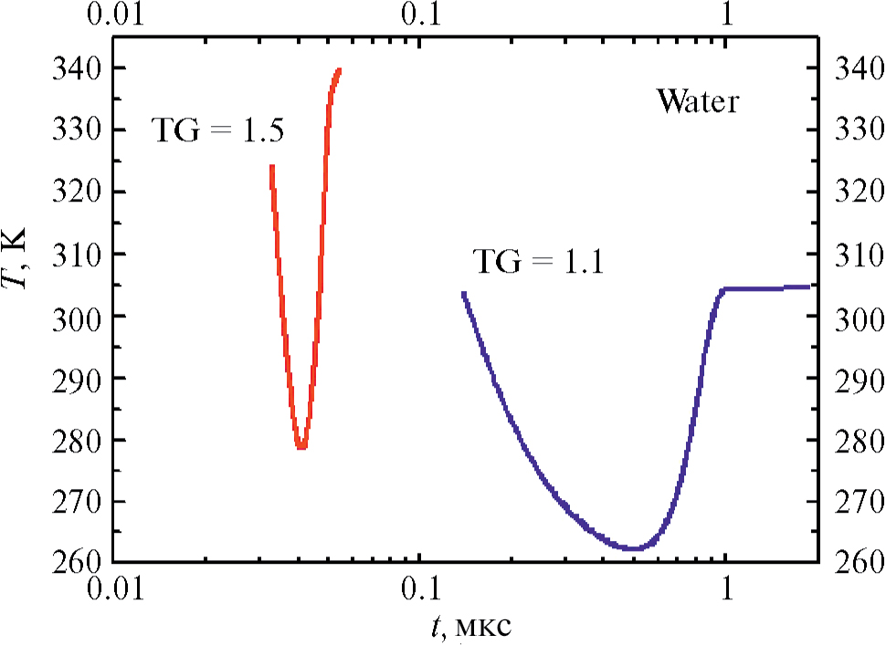 В целом можно сказать, что проявлению процесса объемной конденсации пара вблизи межфазной поверхности при интенсивном испарении способствуют увеличение TG и уменьшение Тcold. Эффект увеличения TG более сильный в связи с тем, что в этом случае одновременно возрастают и степень пересыщения, и температура, при которой происходит конденсация пара. Напротив, в случае снижения Тcold степень пересыщения возрастает при снижении температуры, при которой происходит конденсация пара. В то же время при увеличении TG сокращается время существования пересыщенного состояния пара, а при снижении Тcold – возрастает.