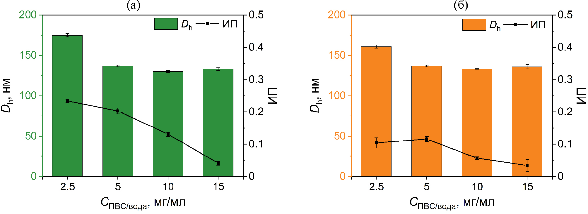 Рис. 1. Зависимости величин гидродинамического диаметра (Dh, нм) и индекса полидисперсности (ИП) (а) ПЛГА-Sn и (б) ПЛГА-Bi наночастиц от концентрации стабилизатора ПВС в водной фазе (СПВС/вода, мг/мл).