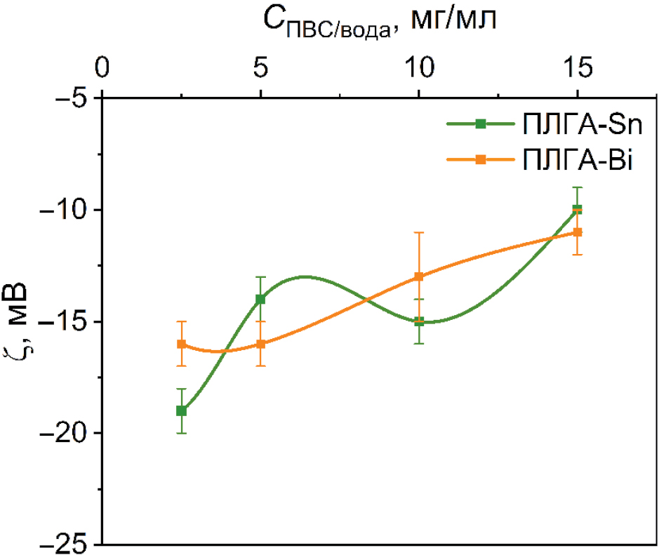 По данным электрофоретического рассеяния света ПЛГА-Sn и ПЛГА-Bi наночастицы характеризуются отрицательными величинами ζ-потенциала независимо от СПВС/вода (рис. 2), что может быть объяснено присутствием на поверхности ПЛГА ядер карбоксильных групп, способных к диссоциации. Увеличение содержания ПВС в системе приводит к нелинейному уменьшению абсолютной величины ζ-потенциала частиц обоих типов (рис. 2), что, по-видимому, связано с более эффективным экранированием карбоксильных групп на поверхности ПЛГА ядер за счет адсорбции большего количества ПВС [28].