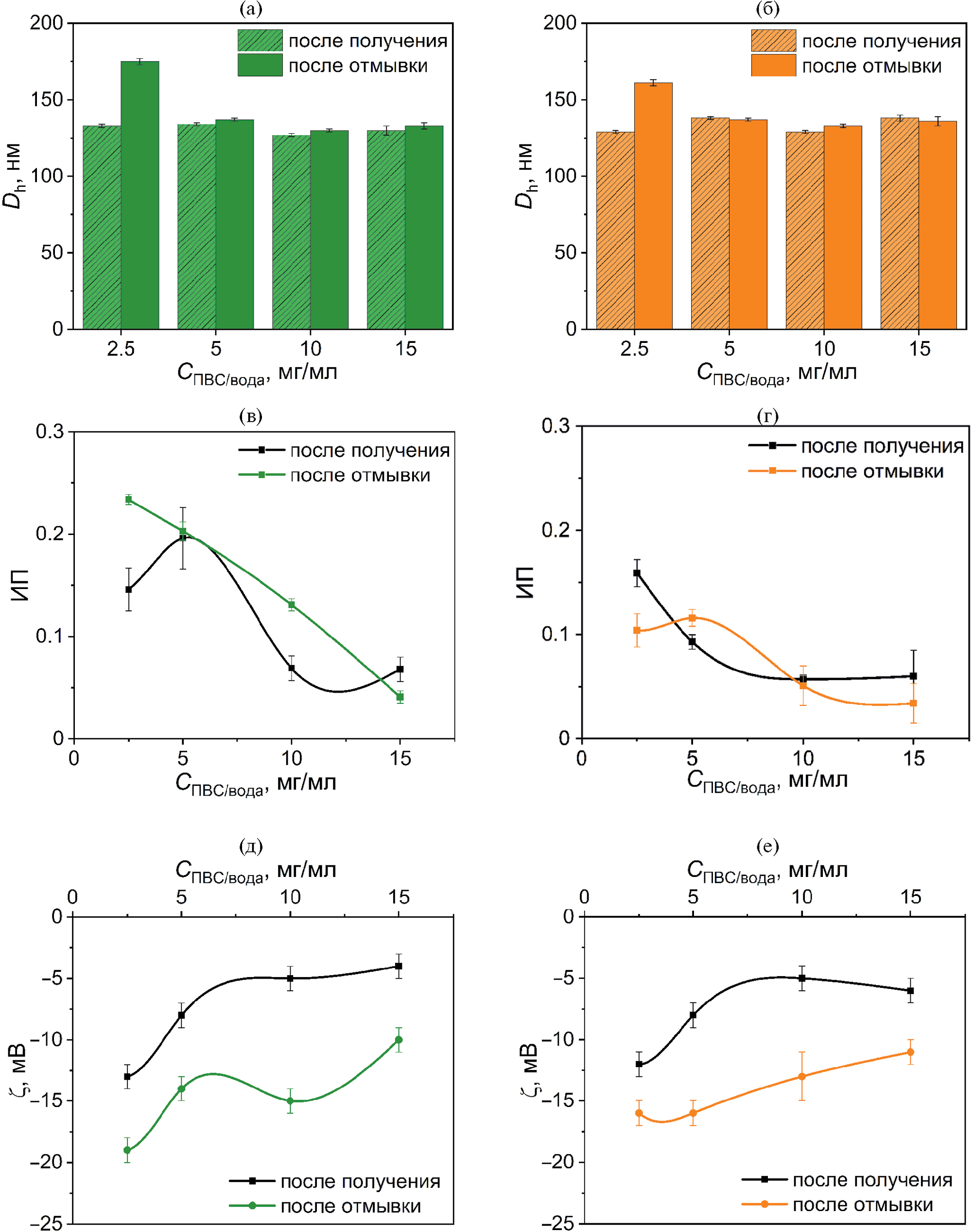 Рис. 3. Зависимости величин среднего гидродинамического диаметра (Dh, нм) (а, б), индекса полидисперсности (ИП) (в, г) и электрокинетического потенциала (ζ, мВ) (д, е) ПЛГА-Sn (левый столбец) и ПЛГА-Bi (правый столбец) наночастиц от концентрации стабилизатора ПВС в водной фазе (СПВС/вода, мг/мл) сразу после получения и после двукратной очистки.