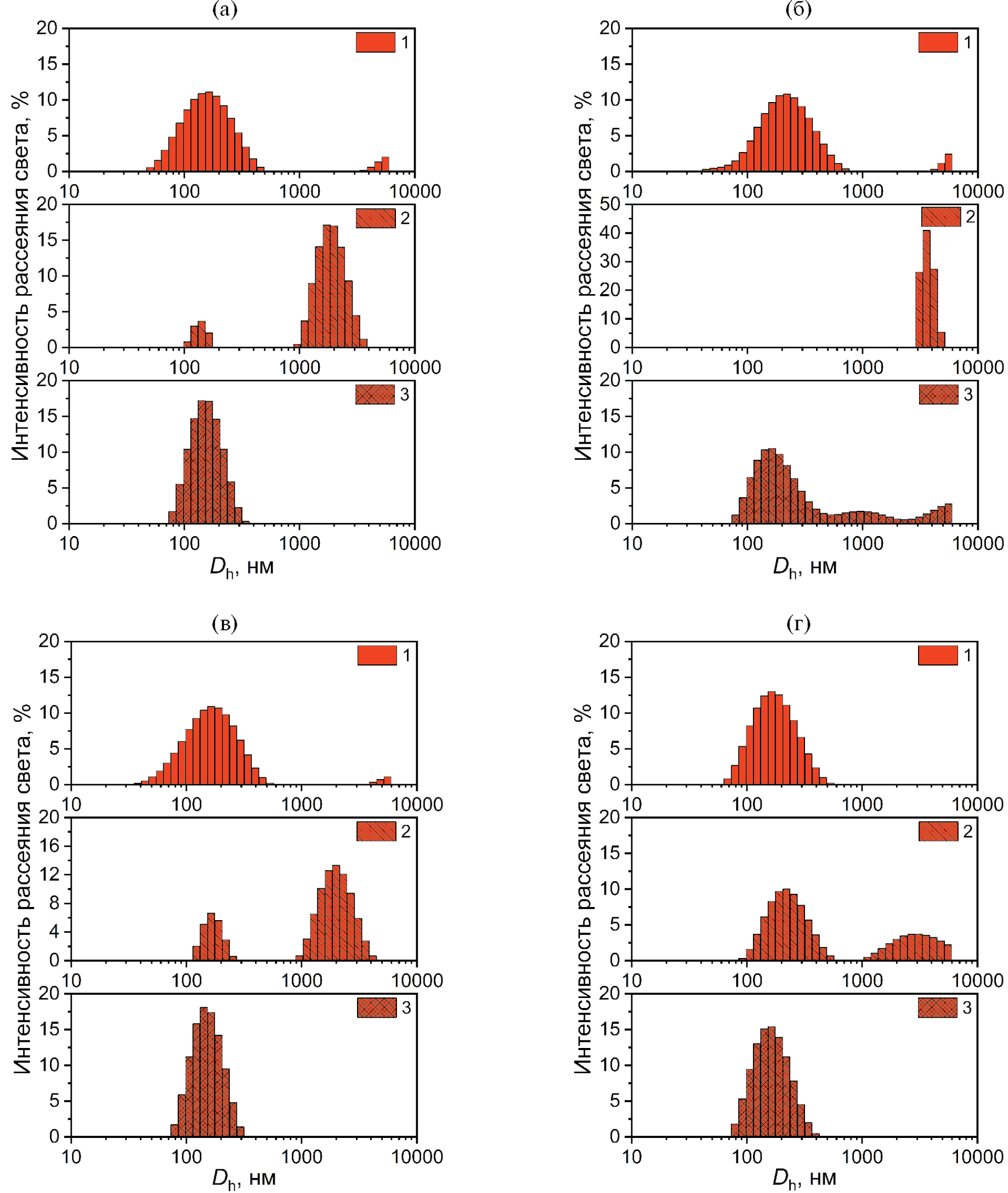 Рис. 4. Распределения интенсивности рассеяния света по гидродинамическим диаметрам (Dh, нм) ДОЦ-нагруженных ПЛГА-Bi частиц, полученных при концентрации стабилизатора ПВС в водной фазе, равной (а) 1, (б) 5, (в) 10 и (г) 15 мг/мл: 1 – в исходной дисперсии (до лиофилизации), 2 – после лиофилизации без криопротектора и последующего ре-диспергирования в воде, 3 – после лиофилизации в присутствии криопротектора D(–)-маннитола и последующего ре-диспергирования в воде.