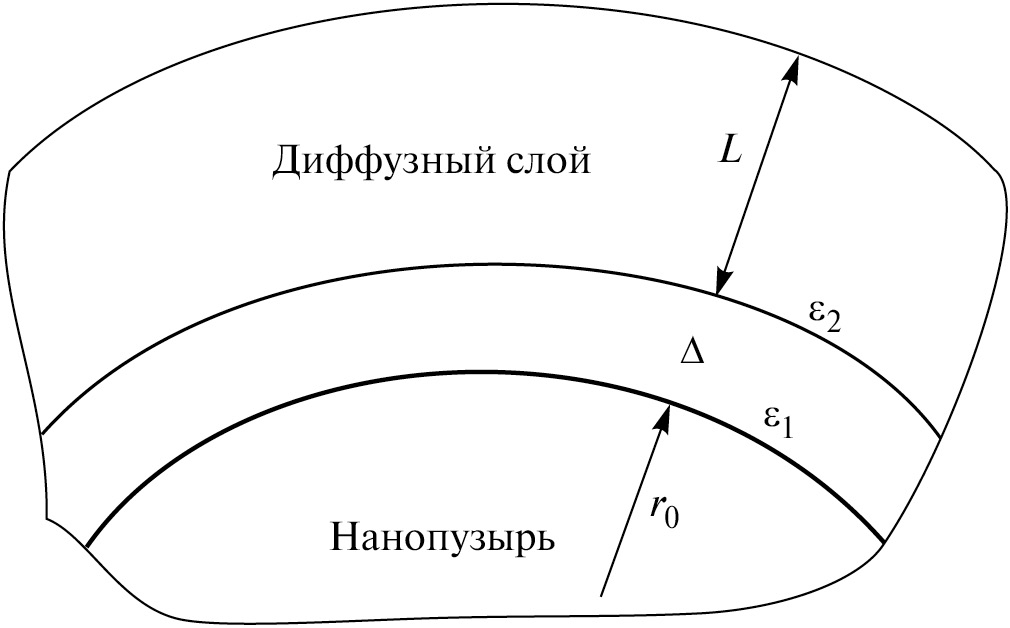 Для практического применения ОНП должны быть стабильными, т. е. иметь большие времена жизни. Механизм обеспечения стабильности широко обсуждался в литературе [21–24]. При гидродинамическом подходе с учетом возможной коалесценции соседних ОНП найдено, что газы, растворенные в электролите, ингибируют коалесценцию ОНП с учетом уменьшения силы притяжения между ними. Так же, но в меньшей степени, влияет градиент поверхностного натяжения при слиянии пузырьков (эффект Гиббса-Марангони) [21, 22]. Отмечалось влияние и гидратации ионов [23]. Более широко распространен электростатический подход [1, 2, 5, 7, 8, 10, 11, 13, 16, 17, 20, 24–31], при котором обычно полагают, что стабильность ОНП обеспечивается тем, что кулоновское и лапласовское PL давления, действующие на границу ОНП, уравновешивают друг друга. Давление газа внутри ОНП не учитывается, т. к. оно на порядки меньше давлений РС и PL во всем диапазоне размеров ОНП. Понятно, что стабильность ОНП имеет термодинамический характер и ее нельзя рассматривать в отрыве от их гомогенной генерации, деления и коалесценции. В работе [28] определены области значений заряда и радиуса, где ОНП устойчивы, коалесцируют и делятся. В работе [29] проведен термодинамический анализ их гомогенной генерации ОНП в пересыщенном водном растворе, вычислены минимальная работа образования и радиус критических зародышей, выведены условия стабильности ОНП. В работе [30] показано, что гомогенная генерация ОНП обусловлена минимизацией энергии Гиббса газожидкостной дисперсной системы. Отметим, что обычно использовалась модель одиночного заряженного пузыря в однородном жидком диэлектрике, которая была уточнена в [31] гипотезой о наличии гидратной оболочки ОНП с толщиной Δ~1 нм, и относительной диэлектрической проницаемостью (ОДП) воды ɛ = 3 с касательной ориентацией диполей. Это объяснялось экономией энергии водородных связей диполей воды в «касательной» структуре оболочки по сравнению с энергией их поляризационной ориентации в предполагаемой ранее «радиальной» структуре. Основанием для этой гипотезы послужили известные результаты метода молекулярной динамики [34], где сказано, что молекулы стремятся сохранять максимальное количество водородных связей, «силы упаковки» создают плотный слой в контакте с поверхностью. Направления дипольных моментов p выравниваются в приповерхностном слое в касательном направлении. Кроме того, сканирующая диэлектрическая микроскопия локальной емкости воды между атомарно плоскими стенками [32] обнаружила вблизи заряженного электрода межфазный Δ-слой (Δ~1 нм, ɛ = 3). Из работы [33] известно, что вблизи границы раздела сред вода упорядочена слоями, простирающимися на несколько молекулярных диаметров от этой границы. Причем ориентацию вектора поляризации диполя определяет водородная связь, а не электрическое поле. В работе [35] также показано, что вода проявляет четкую слоистую структуру вблизи всех поверхностей, независимо от их гидрофильности в пределах Δ ≈ 1 нм от электрода. Поскольку закон экономии энергии универсален, не зависит от формы поверхности, вблизи которой он реализуется, то его действие у протяженных заряженных поверхностей [32–35] справедливо применить и к сферической поверхности ОНП [31]. Возможно, косвенным экспериментальным подтверждением наличия у ОНП электрически «мертвой» оболочки м