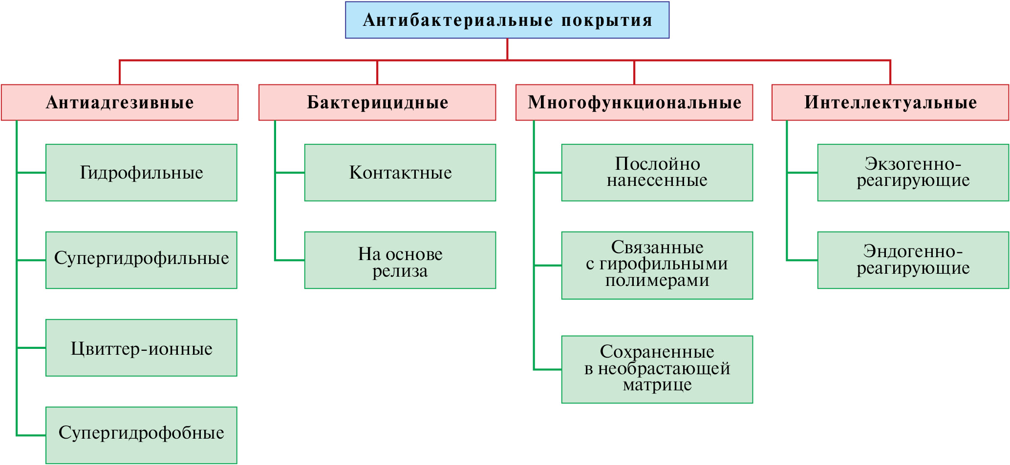 За последние два десятилетия внимание ученых и производителей биомедицинской продукции было сосредоточено на разработке покрытий, способных противостоять бактериальной колонизации, которые можно было бы наносить на различные поверхности и устройства [37, 38]. Антибактериальные покрытия (рис. 1) в зависимости от механизма их действия подразделяются на противомикробные покрытия контактного типа [39–41] и покрытия на основе релиза, антиадгезивные противомикробные покрытия [42–45], многофункциональные покрытия [46–48] и интеллектуальные противомикробные покрытия [49–51].