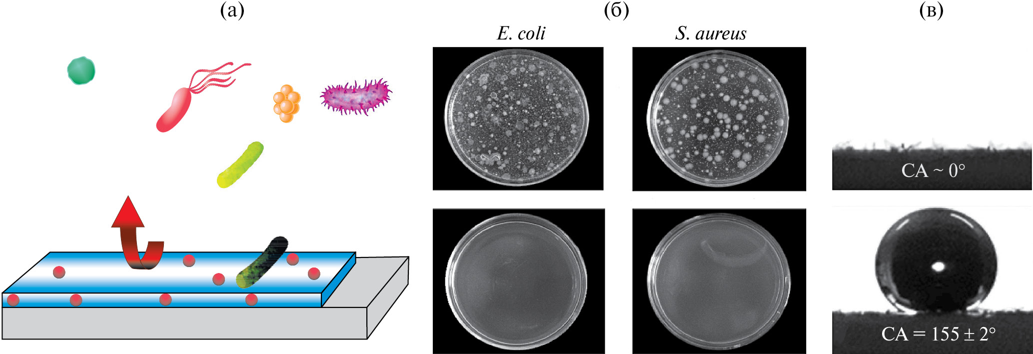 Противообрастающие покрытия только предотвращают адгезию бактерий, а не устраняют их (рис. 3г). Поэтому со временем происходит увеличение концентрации планктонных бактерий в субстрате, что способствует бактериальной обсемененности и приводит к возникновению инфекций. Кроме того, гидрофильные полимеры могут постепенно нейтрализоваться, пассивироваться или разлагаться другими соединениями, такими как белки, соли и амфифилы. Любые локальные дефекты супергидрофобных покрытий могут выступать в качестве мест локальной адгезии для бактерий с последующим формированием биопленок.
