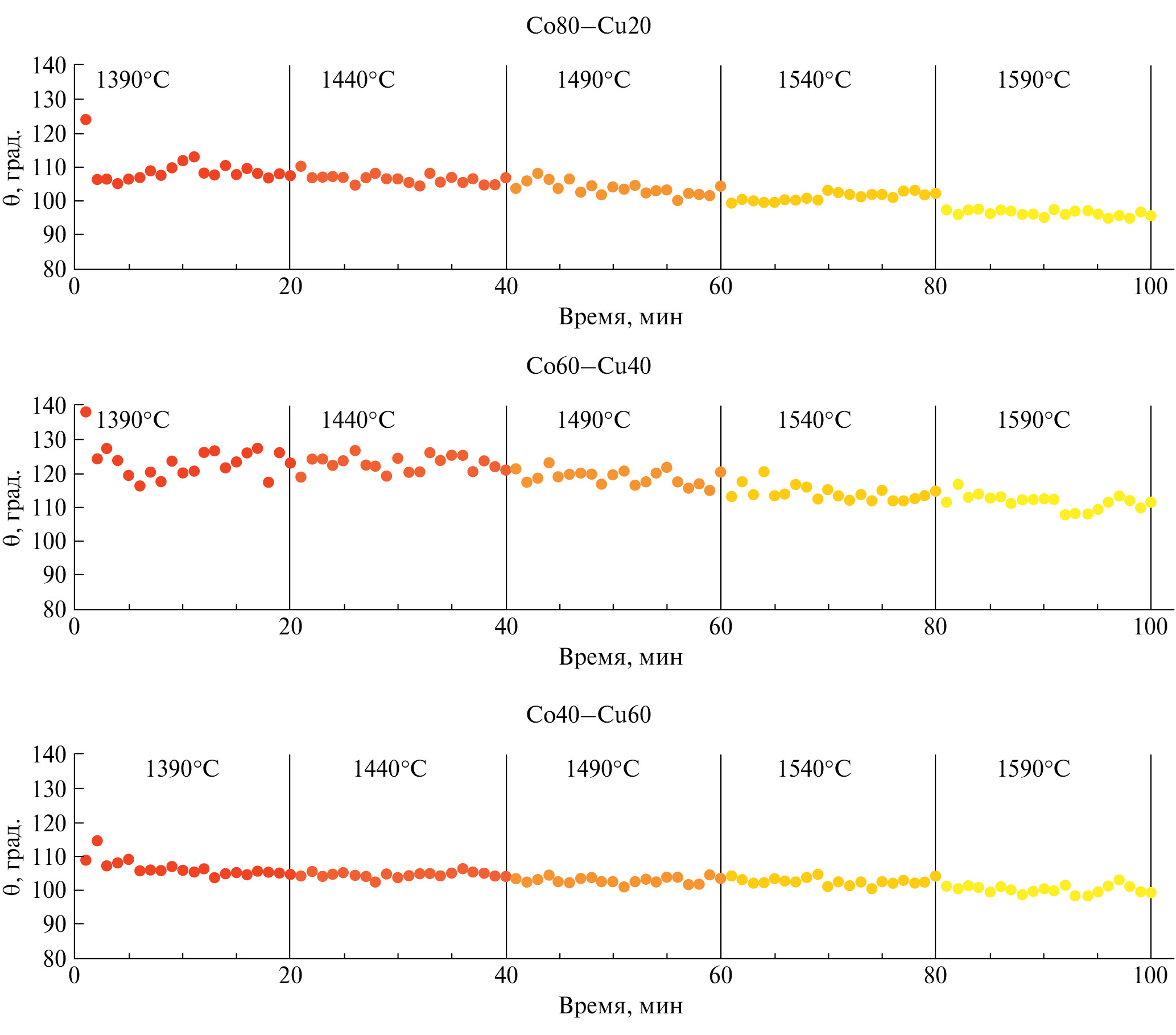 Результаты измерения углов смачивания θ графита расплавами Co–Cu представлены на рис. 1. При нагревании от 1390 до 1590°C конечный контактный угол в опыте с расплавом Co80–Cu20 уменьшается от 125 до 95° (на 24%); в опыте с расплавом Co60–Cu40 от 138 до 110° (на 20%) и от 110 до 100° (на 9%) в опыте с расплавом Co40–Cu60. Таким образом, чем больше в расплаве меди, тем он хуже смачивает поверхность графита. Обращаем внимание, что величина контактного угла мало зависит от времени и слабо уменьшается с температурой: в опытах с расплавами Co80–Cu20 и Co40–Cu60 примерно от 110 до 100°, в опыте с расплавом Co60–Cu40 – примерно от 130 до 110°.