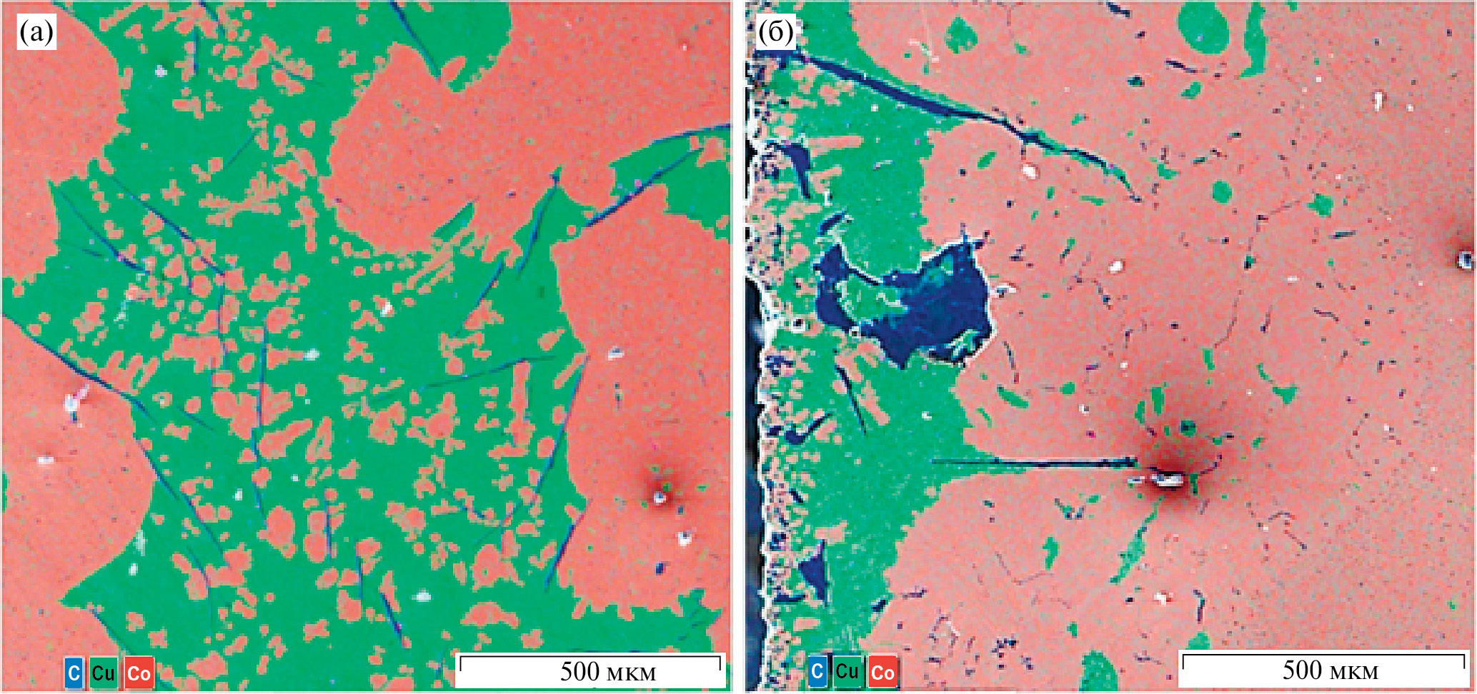 Образование Cu фазы происходит по перитектической реакции из твердого раствора на основе Co и расплава, обогащенного Cu. Наличие эвтектики Co–C приводит к тому, что зарождение медной фазы осуществляется гетерогенно на межфазной поверхности частиц углерода и Co твердого раствора, что создает эффект двухфазных композитных частиц С/Cu. Структура образца металл-углеродного материала Co–40%Cu–С, в отличие от образца Co–20%Cu, очень неоднородна (рис. 6б). У подложки расположен слой меди толщиной ~300–350 мкм. Далее до середины образца и выше простирается обширная зона, обогащенная кобальтом, внутри которой в виде зон (зерен) неправильной формы расположена фаза на основе меди. Внутри этой фазы находятся кристаллы кобальта дендритной морфологии. На рис. 6а показана граница Co и Cu зон и дендриты Co в Cu зоне.