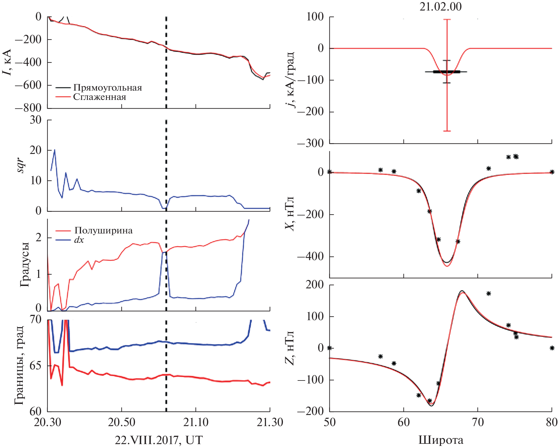Продолжается разработка простой “прямоугольной” модели западного аврорального электроджета, основанной на наблюдениях магнитного поля вдоль разреженной меридиональной цепи станций в полярной зоне. Модель имеет три параметра: две границы и постоянную плотность электрического тока. Работа модели показана на примере суббурь, наблюдаемых на цепочке станций CARISMA (англ. Canadian Array for Realtime Investigations of Magnetic Activity). Был введен дополнительный параметр, позволяющий менять меридиональный профиль тока от прямоугольного к колоколообразному, но его влияние на работу модели оказалось слабым. В заключение проведено сравнение оценок полной силы электроджета, полученных по этой модели, с оценками суббуревого токового клина, полученными по среднеширотным станциям. Обе оценки имеют схожие амплитуды и изменяются согласованно в течение развития взрывной фазы суббури. Величины тока в определенные моменты времени могут различаться в два раза, но схожие различия наблюдаются и для других моделей западного аврорального электроджета. Последнее предполагает, что реальная геометрия тока электроджета и тока клина могут значительно отличаться от используемых относительно простых моделей.