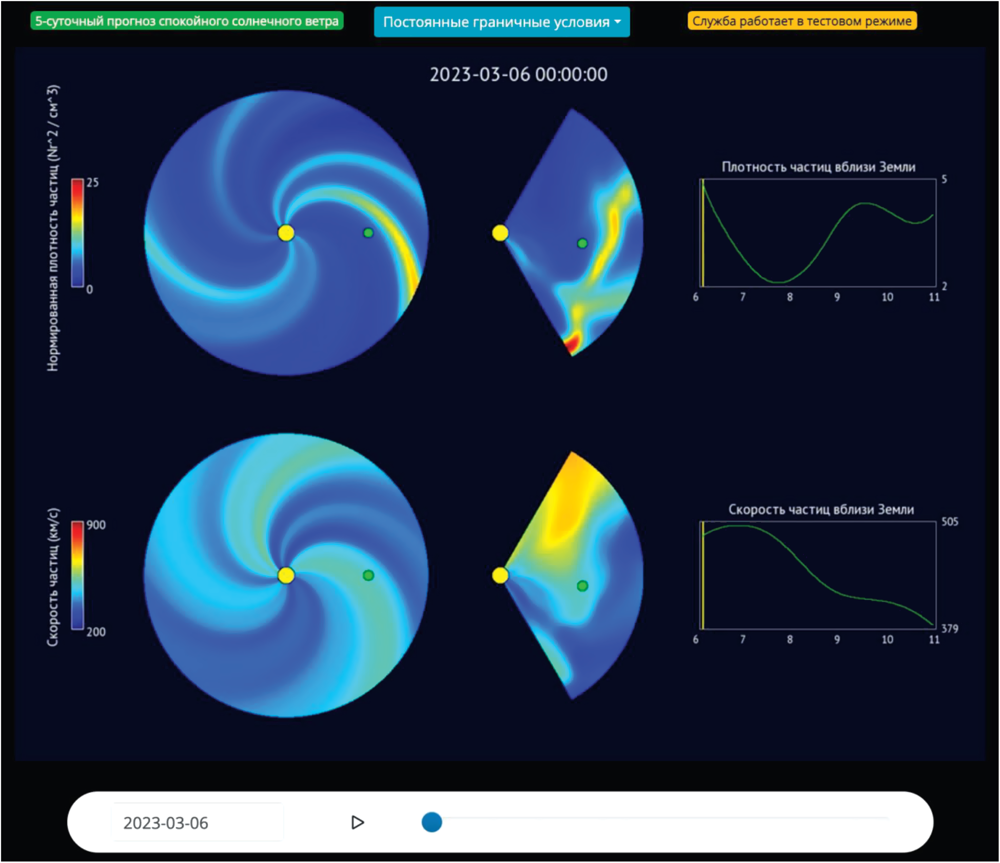 A prototype service for MHD modeling of the calm solar wind and forecasting the speed and density of solar wind particles in interplanetary space, similar to the NOAA and ESA services, has been created. The service consists of an MHD simulator, a module for processing simulation results, and a web interface. The simulator is based on the implementation of the TVDLF method in the PLUTO package. The boundary conditions of the model (density, radial velocity, magnetic field, temperature) at a distance of 0.1 AU from the origin are obtained regularly from the corresponding NOAA service, in which they are calculated according to the WSA model based on the magnetograms of the GONG network. Two modes of boundary conditions are available: constant and daily. The simulations were carried out on a uniform grid in the range of 0.1–1.7 AU by distance (512 elements), –60°...+60° by latitude (60 elements), 0°–360° by longitude (180 elements). The calculated particle velocity and density maps are compared with the NOAA SWPC and NASA CCMC calculations under the same boundary conditions. A retrospective comparison of the resulting forecasts with data from direct measurements (OMNI) was carried out.