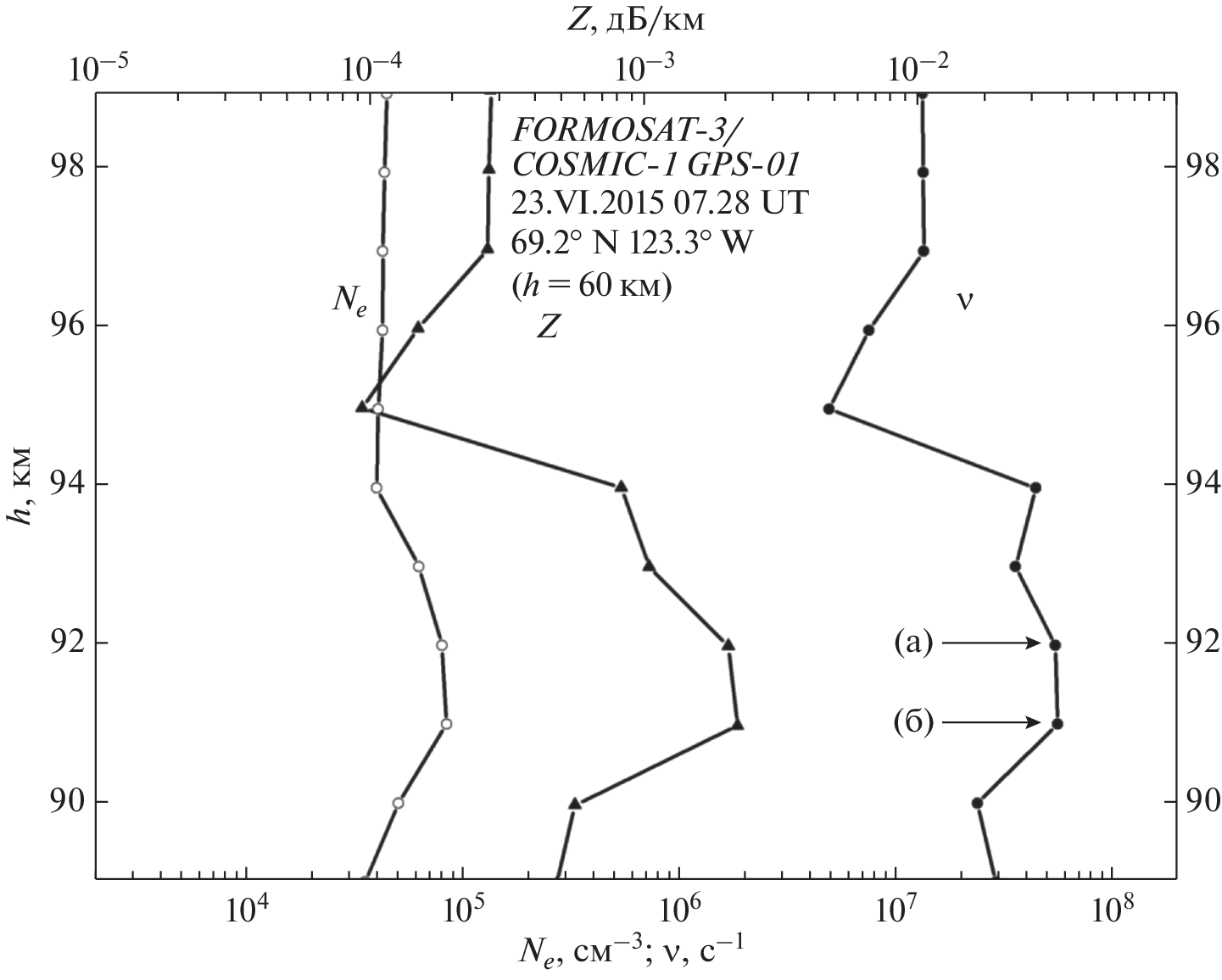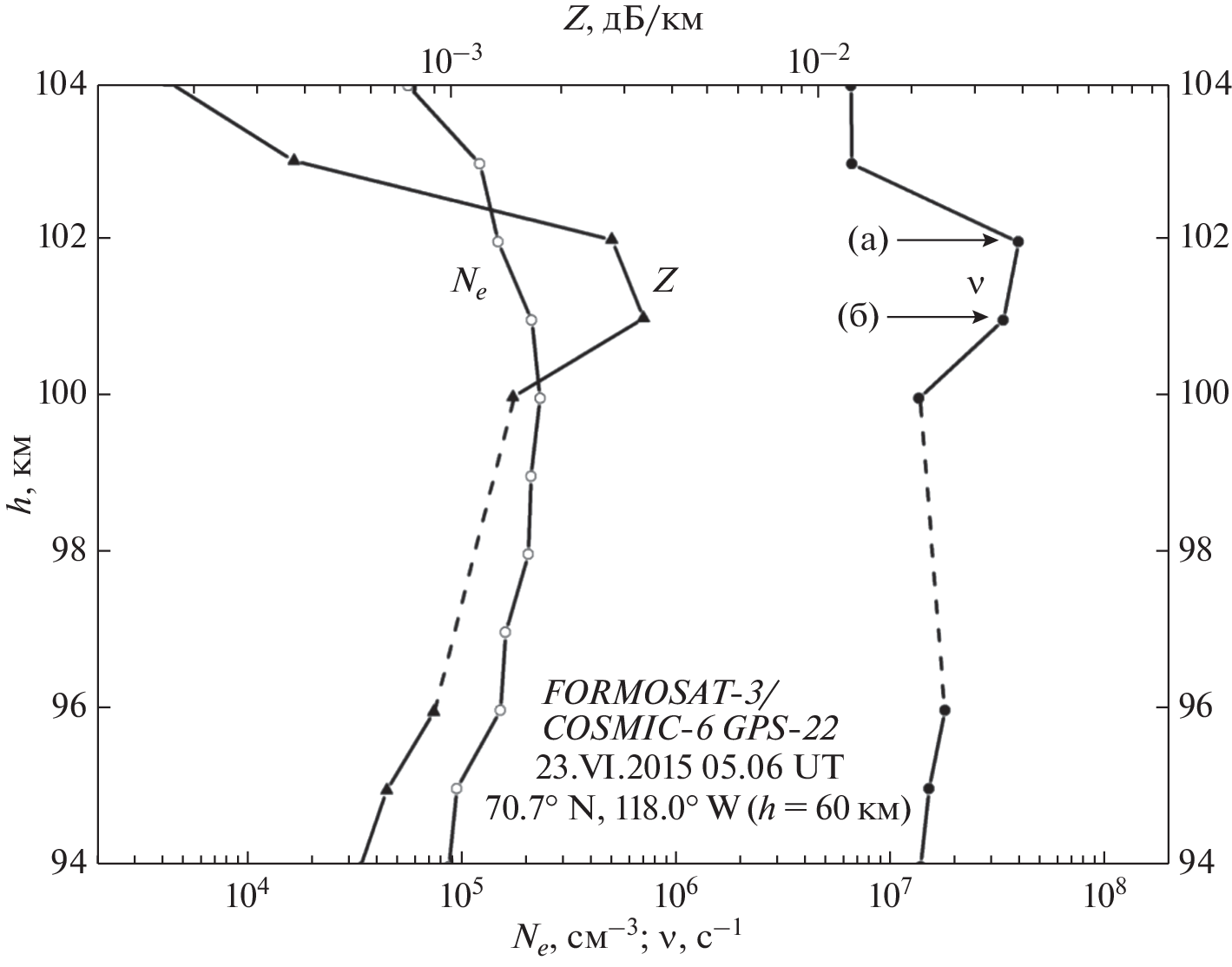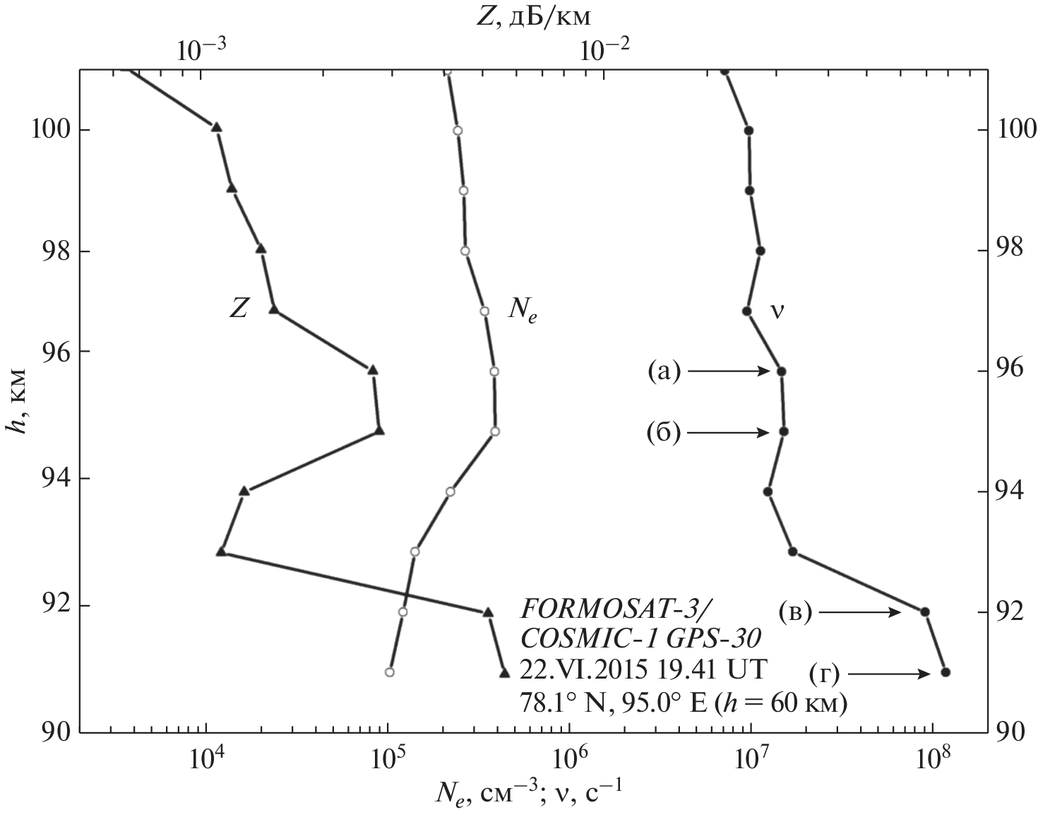 Изучение столкновений между электронами и нейтральными молекулами представляет особый интерес для физики ионосферы Земли, в частности, с точки зрения определения ионосферной проводимости и токовых систем в нижней ионосфере планеты и выяснения роли, которую эти столкновения играют в ослаблении радиоволн, распространяющихся внутри D- и Е-областей ионосферы. Эффективную частоту столкновений электронов можно оценить по лабораторным исследованиям подвижности электронов в атмосферных газах в сочетании с ракетными измерениями температуры и плотности частиц в верхней атмосфере Земли, также ее можно определить независимо из анализа радиозатменных данных. Нами разработан метод восстановления вертикальных профилей коэффициента поглощения дециметровых (длина волны ∼19 см) радиоволн, базирующийся на решении обратной задачи о поглощении сигнала в D- и Е-областях ионосферы Земли. По результатам анализа радиозатменных данных спутников FORMOSAT-3/COSMIC были определены высотные профили коэффициента поглощения дециметровых (ДМ) радиоволн в ионосфере планеты во время магнитной бури 22–23.VI.2015. Известно, что величина коэффициента поглощения на данной фиксированной частоте прямо пропорциональна произведению электронной плотности и частоты столкновений электронов с ионами и нейтралами. С использованием полученных данных о вертикальных профилях коэффициента поглощения ДМ-радиоволн и электронной плотности, восстановленных из анализа радиозатменных данных FORMOSAT-3/COSMIC, была оценена эффективная частота столкновений электронов в D- и Е-областях высокоширотной ионосферы Земли. Практическая значимость изучения частоты столкновений электронов и эффектов поглощения радиоволн в D- и Е-областях ионосферы планеты связана с обеспечением бесперебойной работы систем космической радиосвязи и навигации.
