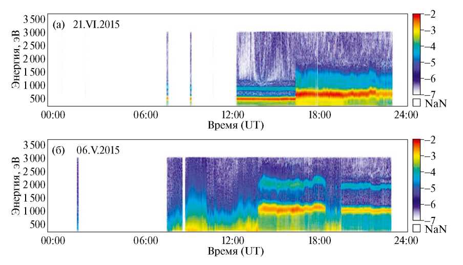 Рис. 1. Спектрограммы пересечения: а – фронта МУВ 21.VI.2015; б – фронта ОЗУВ для события 06.V.2015. По оси абсцисс отложено время в UT в течение одних суток, по оси ординат – энергия запирающей сетки. Повышение концентрации потока ионов показано шкалой насыщенности цвета.