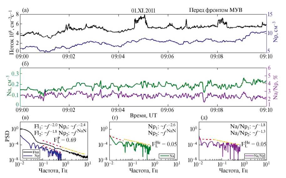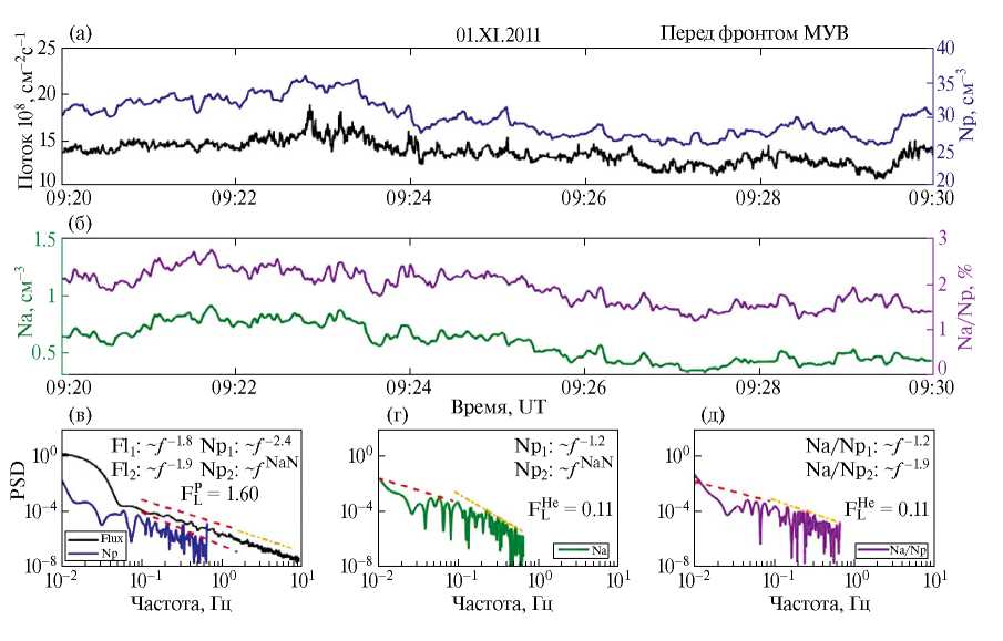 Пример рассматриваемого спектра приведен на рис. 2 для 01.XI.2011. На верхней панели (а) представлен полный поток ионов солнечного ветра, а также плотность протонов. Ниже, на панели (б), приведены абсолютная и относительная плотность альфа-частиц. Буквами в–д обозначены панели со спектрами флуктуаций: (в) – потока ионов и плотности протонов, (г) – абсолютной плотности альфа-частиц, (д) – относительной плотности альфа-частиц.