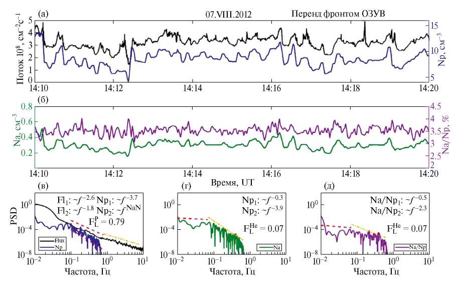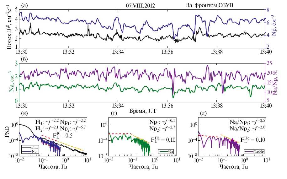 На рис. 5 показаны параметры и спектры флуктуаций концентрации ионов в невозмущенном солнечном ветре перед фронтом ОЗУВ. Спектр флуктуаций концентрации протонов (см. панель (в)) визуально изменяет наклон около верхней границы спектра, однако теоретическая оценка значения точки перегиба выходит за рамки измерения, в связи с этим предполагается влияние магнитного поля (частоты, соответствующей гирорадиусу). Спектр флуктуаций концентрации альфа-частиц имеет явный излом на частоте 0.08 Гц и второй, не такой заметный, в районе 0.4–0.5 Гц (см. панель (г)).