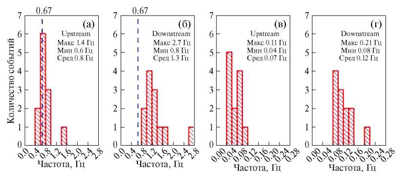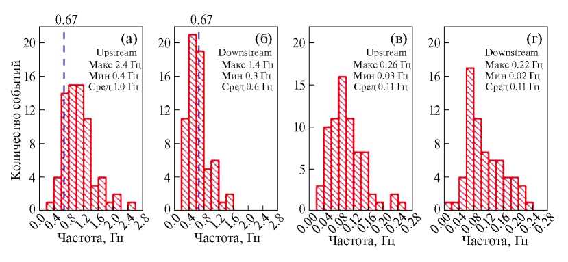 Рис. 7. Гистограммы частоты излома для протонов (панели (а), (б)) и альфа-частиц (панели (в), (г)). Панели (а) и (в) относятся к невозмущенной области, панели (б) и (г) – к области за фронтом МУВ. На панелях представлены максимальные, средние и минимальные значения параметра.