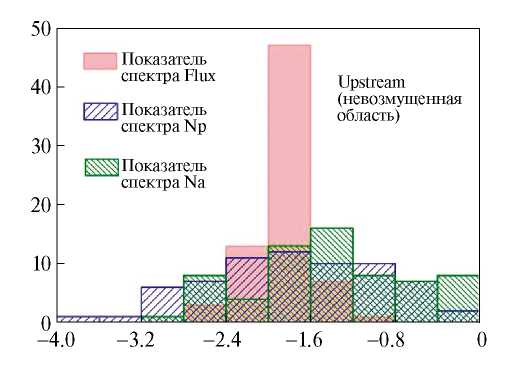 На рис. 8 представлена сводная гистограмма распределения наклона спектра до излома (МГД-масштаб) для трех параметров плазмы солнечного ветра: полного потока ионов, абсолютной концентрации протонов и альфа-частиц. Для полного потока распределение показывает явный максимум вблизи колмогоровского наклона (–5/3). Однако для концентрации ионов по отдельности ситуация значительно отличается. Распределение оказывается гораздо шире, без ярко выраженного максимума, особенно для протонов, что стало достаточно неожиданным результатом.