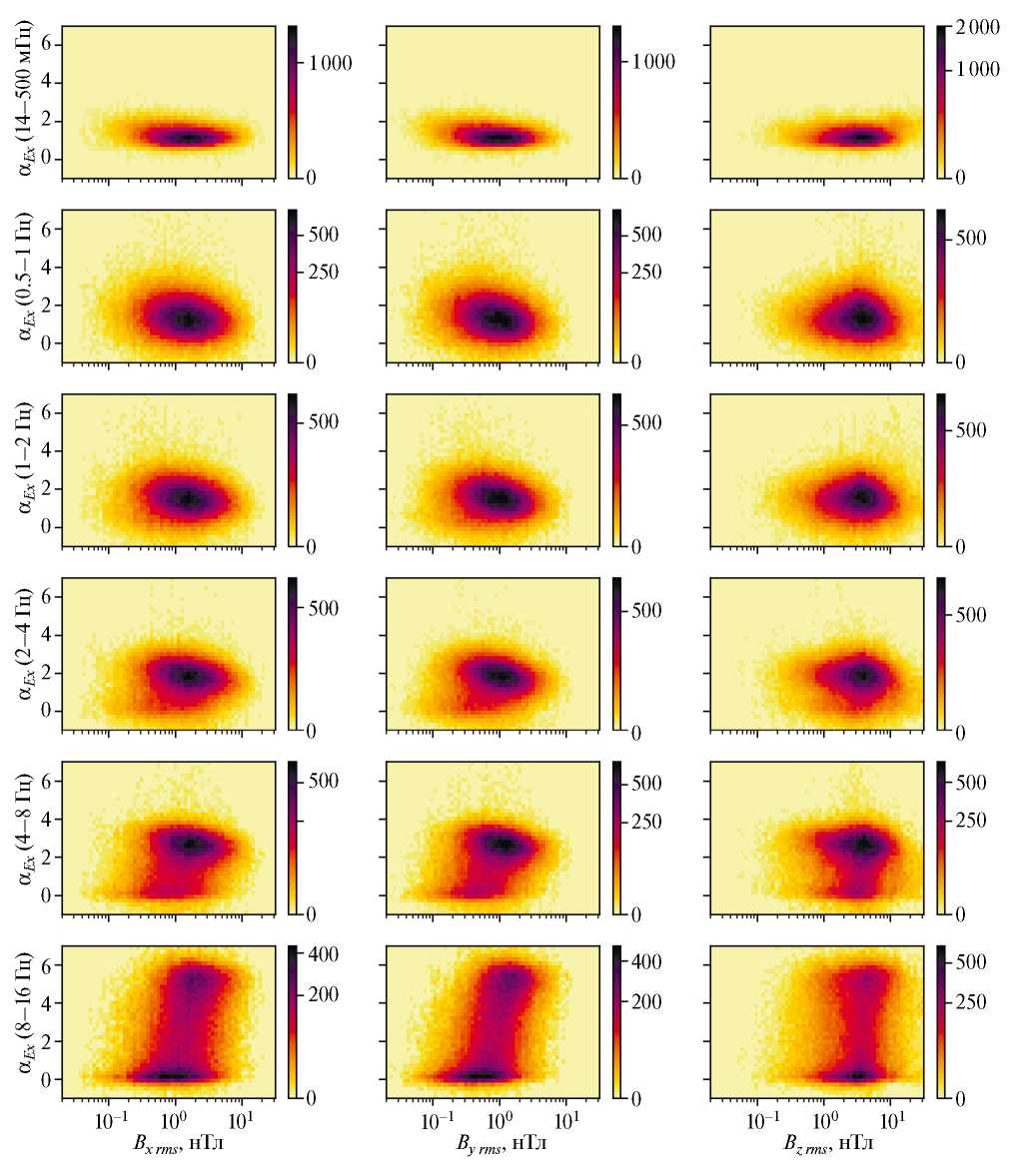 Анализ рис. 2 и 4 выявил возможность существования зависимости показателей спектров от уровня магнитных флуктуаций. Для проверки данного предположения были построены зависимости усредненных показателей спектра от усредненных уровней компонент электрического поля и магнитного поля. На рис. 5, 6 показаны двумерные гистограммы спектральных индексов для х-компонент электрического и магнитного поля в зависимости от усредненных по интервалу компонент электрического и магнитного поля. Двумерные гистограммы для других компонент и перекрестные гистограммы содержатся в дополнительном материале. Каждая точка соответствует одному 12-минутному интервалу. Уровень разброса точек характеризует разброс полученных значений. Как указано выше, близкие к нулю значения показателей спектра не имеют физического значения и соответствуют уровню флуктуаций, не превышающему уровня шумов приборов. В ряде случаев наблюдается тенденция уменьшения наклона спектра с ростом уровня флуктуаций.