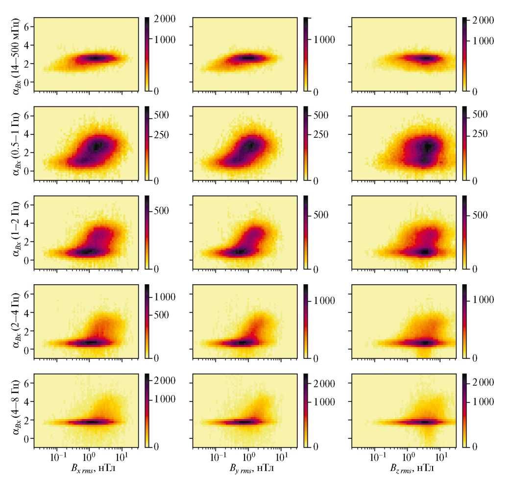 Рис. 9, П1. Двумерные гистограммы зависимости спектральных индексов z-компоненты магнитного поля от уровня флуктуаций компонент электрического поля. Цветом показано количество случаев.