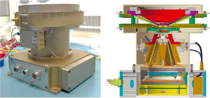 Прибор «ТОТЭМ-Э» представляет собой спектрометр электронов, позволяющий разделять отрицательно заряженные частицы по соотношению E/Q с использованием электростатического метода анализа. Внешний вид прибора и его сечение, демонстрирующее внутреннее строение, приведены на рис. 1.