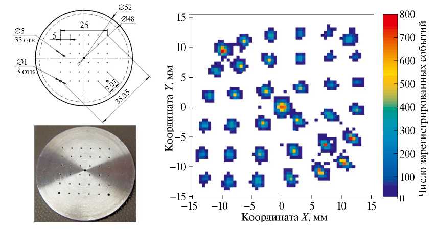 Одними из важных характеристик КЧД, от которых зависят аналитические свойства всего прибора, считаются равномерность регистрации частиц в зависимости от координаты и точность определения координаты прилета частицы. Для определения этих параметров на входное окно КЧД устанавливалась специально разработанная диафрагма, представляющая собой совокупность отверстий диаметром 0.5 и 1 мм, после чего осуществлялось облучение детектора потоком электронов с энергиями от 1 кэВ, фиксировался счет детектора и координаты регистрируемых частиц. Структура диафрагмы, а также распределение частиц по поверхности детектора, полученное в результате этого эксперимента, приведены на рис. 5.