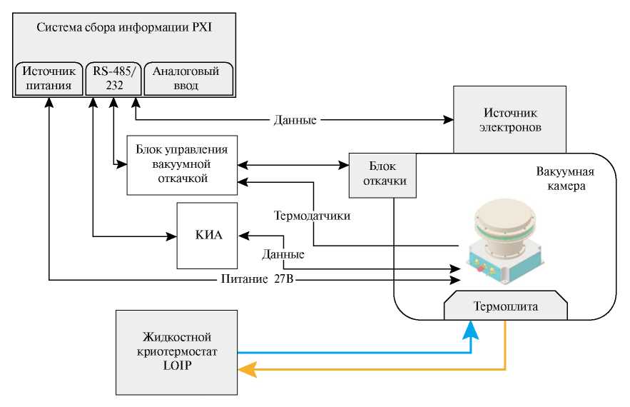 Для наземных испытаний образцов прибора «ТОТЭМ-Э» создано рабочее место, включающее в себя вакуумную камеру с безмасляной системой откачки, оснащенную источником электронов, систему сбора и обработки информации, низковольтные и высоковольтные лабораторные источники питания, жидкостной криотермостат. Внутри вакуумной камеры расположена термоплита, предназначенная для размещения образцов прибора. Термоплита также оборудована манипулятором, обеспечивающим вращение прибора вокруг своей оси на 360°. Рабочее место аттестовано не только для проведения функциональных испытаний и физических калибровок образцов приборов, создаваемых для КНА-С, но и для проведения их термовакуумных испытаний в диапазоне температуры от –70 до +70 °C. Структура рабочего места показана на рис. 6.