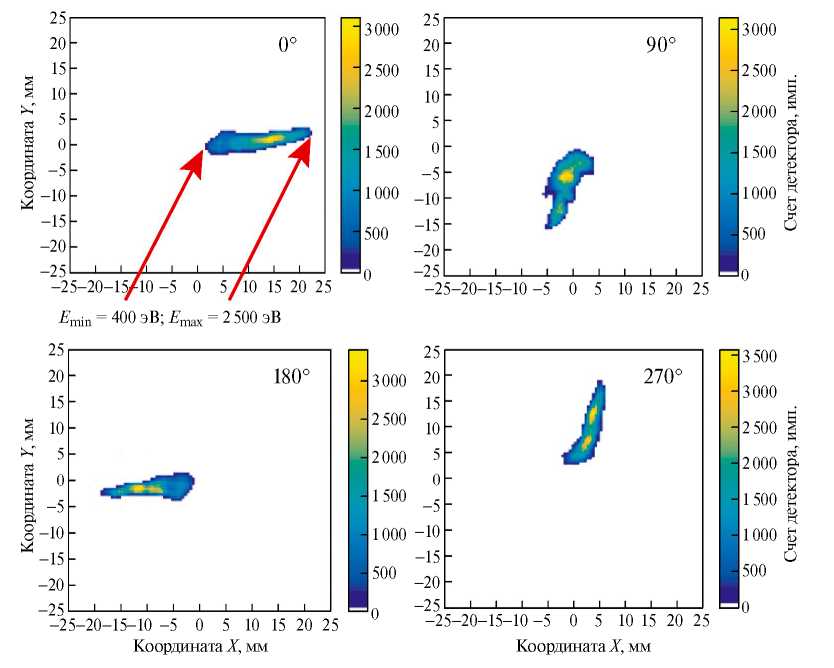 При проверке диапазона энергий, одномоментно регистрируемого прибором, на элементах модуля электронной оптики (МЭО) устанавливался постоянный потенциал, соответствующий средней энергии регистрируемых частиц ~600 эВ, а энергия электронов изменялась от нижней до верхней границы регистрируемой энергии с шагом 100 эВ. Данная проверка выполнялась для азимутальных углов 0, 90, 180 и 270°. Проверка показала, что при потенциале 600 В минимальная энергия частиц, регистрируемых прибором, составляет 400 эВ, максимальная – 2500 эВ. Таким образом, диапазон одномоментно регистрируемых энергий составляет 6.5Е0, где Е0 – минимальная энергия регистрируемых частиц для выбранных потенциалов на элементах электронной оптики. Совокупное распределение частиц различных энергий для четырех азимутальных углов приведено на рис. 8.