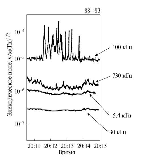 Рис. 2. Импульсы электромагнитного излучения, зарегистрированные 08.II.1979 г. прибором OEFD на борту орбитального модуля Pioneer Venus, Орбита 66. Импульсы наблюдались в низком перицентре орбиты аппарата.