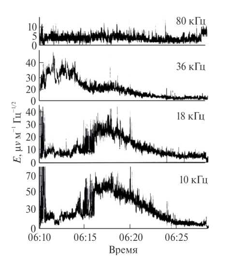 Периодичность возникала благодаря ограниченным угловым размерам удаленного источника и вращению аппарата. Приемник «Гроза» имел петлевую (рамочную) антенну, диаграмма направленности которой имела форму «восьмерки». Как было показано в работе [4], источник был локальным и находился на расстоянии менее тысячи километров. Его импульсы имели более высокую амплитуду по сравнению с фоном, напряженность поля на частоте 10 кГц достигала 100 мкВ м–1 Гц½ (рис. 4). Можно было сделать вывод, что удаленным источником может быть локальная гроза. Рассматривалось и предположение о другой природе источника импульсов, возможно, привязанного к какому-то объекту на поверхности планеты.