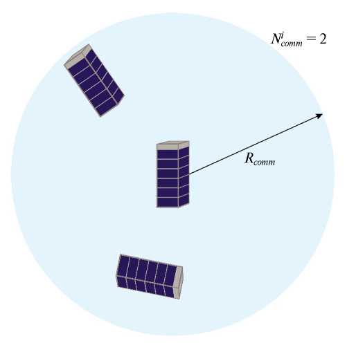Так как основной целью управления является устранение относительного параметра дрейфа Cij, рассмотрим управление по оси Ox, построенное на основе средних значений параметров дрейфов аппаратов внутри группы. Для i-го МКА известно относительное движение не всех аппаратов в группе, а только тех, которые попадают в его зону видимости. Зона видимости представляет собой сферу радиуса Rcomm с центром в центре масс i-го МКА. Количество аппаратов, попавших в такую зону, обозначается (рис. 3).