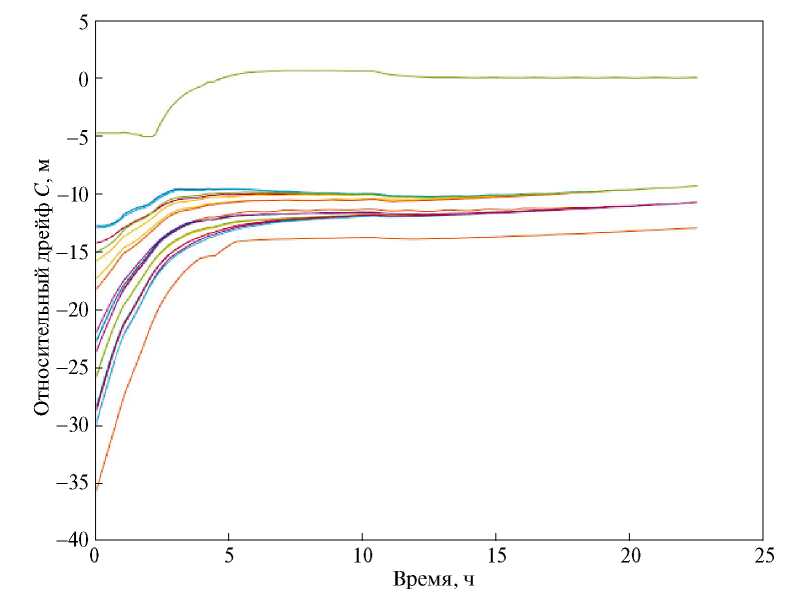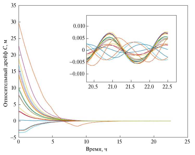 Для начальных условий, представленных в табл. 1, необходимый Rcomm, согласно (19), составляет 802 м. На рис. 4 представлены траектории движения всех спутников относительно первого запущенного аппарата, которые, как видно, постепенно становятся замкнутыми, и таким образом аппараты образуют связную группу. Изменение величин относительных параметров дрейфа вычисленных также относительно первого запущенного аппарата, представлено на рис. 5. Для рассматриваемого примера относительные параметры дрейфов спутников сходятся к нулю, что ещё раз подтверждает, что относительные траектории спутников в группе становятся ограниченными. Также можно заметить, что устранение относительного параметра дрейфа происходит за первые 15 ч после запуска. После этого величины параметров дрейфов по модулю не выходят за границы 0.01 м.