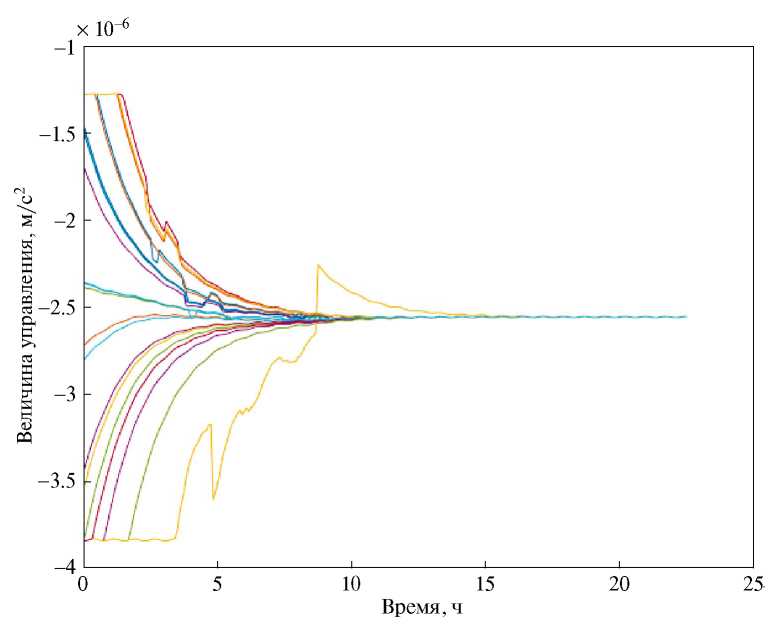 На рис. 6 представлен график приложенного ко всем спутникам в рое управления в зависимости от времени. Предполагается, что на все аппараты действуют силы аэродинамического сопротивления, поэтому величина управления вдоль оси Ox ОрбСК отрицательна. Коэффициент управления k подобран таким образом, чтобы величина управления не превышала ускорение, которое возможно получить с помощью силы аэродинамического сопротивления путём поворота 3U кубсата (параллелепипед с размерами 10 × 10 × 34 см) относительно набегающего потока. При этом учитывались характерная плотность воздуха на данной высоте орбиты и возможные средние значения параметров траекторий C и D при заданных условиях отделения. Если для некоторых аппаратов в начальный момент времени требуемое управляющее ускорение превышало максимально допустимое значение, в численном моделировании реализовывалось это максимальное значение управляющего ускорения. Отметим также, что по мере уменьшения относительных параметров дрейфа разница приложенного управления уменьшается. Резкие изменения величины приложенного управления соответствуют моментам времени, когда количество аппаратов в зоне видимости изменяется, или моментам переключения между законами управления (18). Изменение во время моделирования представлено на рис. 7.