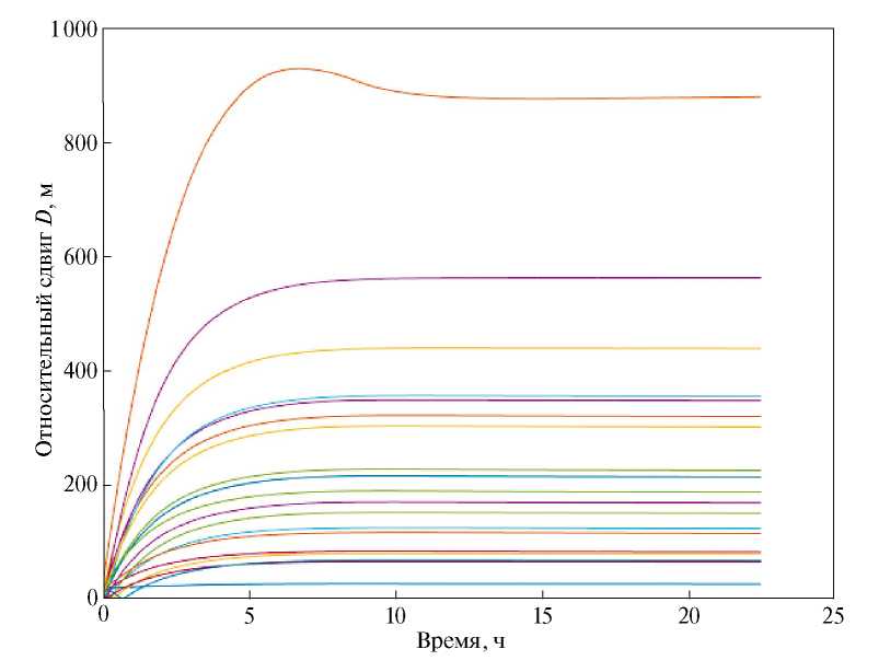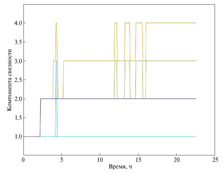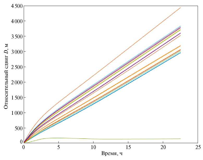 Количество подгрупп, на которые разделяются аппараты, равно количеству компонент связности графа, который образуют спутники с их коммуникационными связями. Изменение числа компонент связности за время моделирования можно увидеть на рис. 12. В течение первых 2 ч 10 мин управления компонента связности одна, и все аппараты образуют связный граф. После этого граф становится несвязным, а к концу моделирования число компонент связности становится равным четырём, что подтверждает разделение МКА на четыре независимые подгруппы. Так как относительные параметры дрейфов сходятся к ненулевым значениям, то из уравнений на параметр Dij (4) следует, что относительные параметры Dij для всех спутников линейно растут от времени, что можно увидеть на рис. 13.