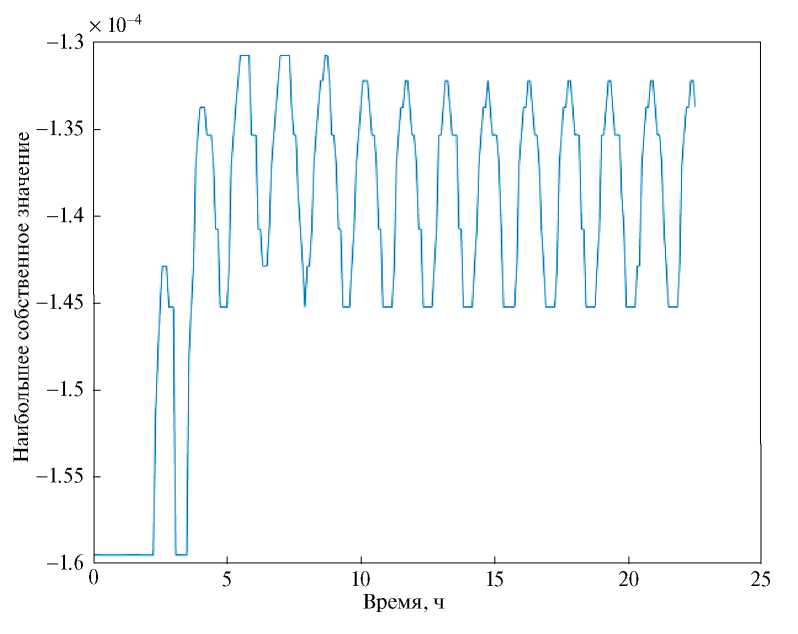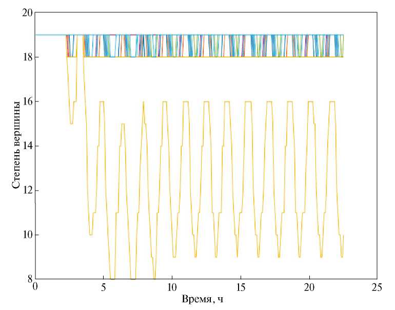 На рис. 8 представлено изменение степеней вершин графа, который образуют МКА в течение моделирования. В течение первых 2.25 ч степень всех вершин в графе равна 19, а значит, МКА образуют полный граф. Далее степень вершин варьируется от 8 до 19, что означает, что некоторые аппараты всё ещё могут отслеживать движение всех спутников в группе, а некоторые только какой-то подгруппы спутников. Несмотря на это, МКА образуют связный граф на протяжении всего моделирования. Так как вид графа меняется во время моделирования, то меняется и скорость сходимости. На рис. 9 показана величина , определяющая скорость сходимости, что является наибольшим собственным значением, за исключением нуля для матрицы системы (8) в случае устранения средних параметров дрейфа.