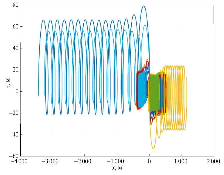 где — наименьшее положительное собственное число матрицы S, определяемой в (9); — время между запусками; — среднеквадратический сдвиг относительных траекторий при свободном относительном движении после кластерного запуска с заданными случайными ошибками отделения. Все параметры, используемые для моделирования управляемого движения группы МКА, представлены в таблице. Минимальное собственное значение матрицы S было посчитано для полного графа с 20 вершинами. Интервал между пересчётом управления означает, что каждые 300 с данные о положениях МКА обновляются. По этим данным рассчитываются средние относительные параметры дрейфа и сдвиги, и получаются новые величины требуемого управления для каждого МКА. Так как движение вдоль оси Oy ОрбСК является ограниченным согласно (2), траектории движения МКА представлены в проекции на плоскость Oxz.