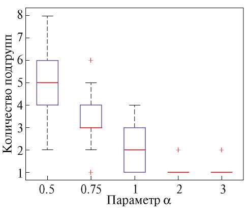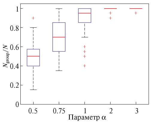 Для каждого значения параметра , где , было проведено сто численных экспериментов c различными скоростями отделения. Значение и количество подгрупп вычислялись по результатам каждого численного моделирования. Результаты исследования представлены на рис. 14 и 15 в виде диаграммы размаха, где 50% результатов находятся внутри прямоугольника, горизонтальная черта в прямоугольнике соответствует медиане, на отрезки сверху и снизу прямоугольника приходится по 25% результатов, крестики соответствуют выбросам. Из рис. 14 и 15 видно, что начиная с величины эффект разделения роя практически не наблюдается, что означает, что предложенный алгоритм успешно справляется с задачей удержания коммуникационной связности роя МКА.