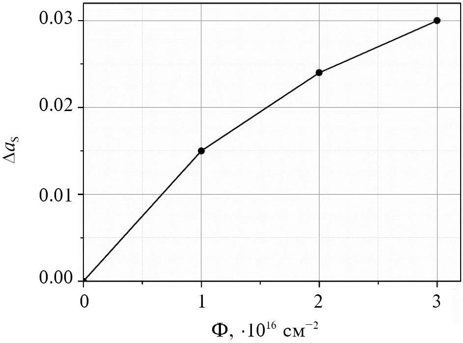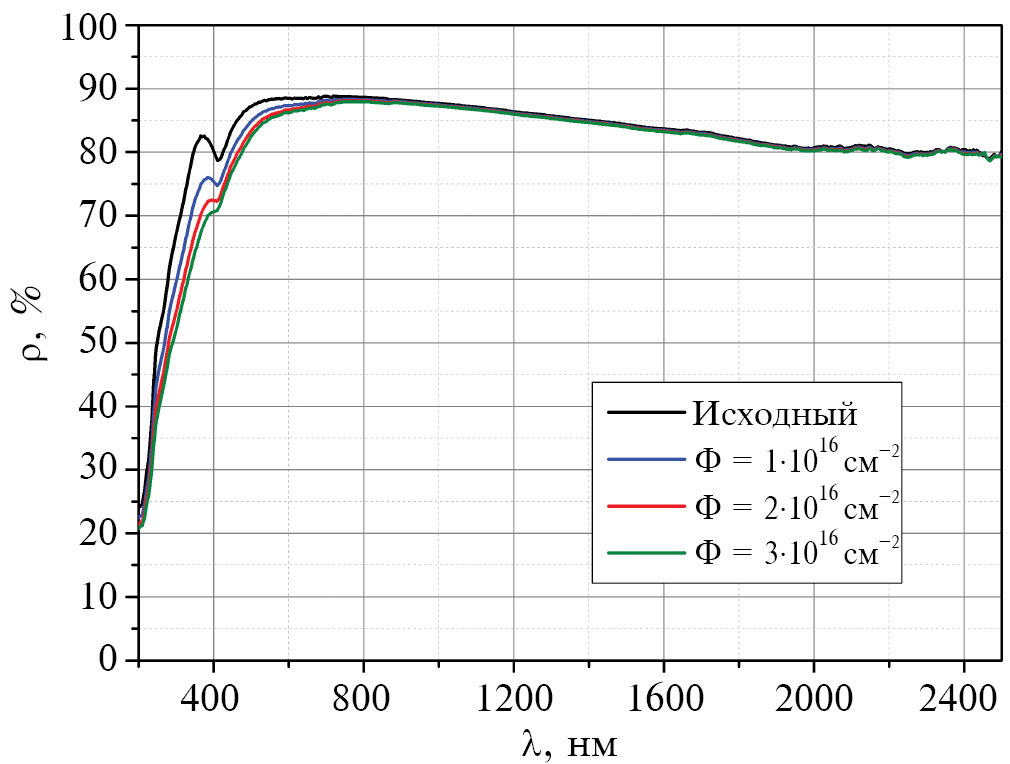 Увеличение коэффициента поглощения составляет 0.015, 0.024 и 0.03 для флюенса электронов (1, 2 и 3) ·1016 см–2 соответственно. Эти величины показывают высокую радиационную стойкость разрабатываемого покрытия. Их сравнение проводили со значениями, полученными ранее для современного перспективного ТРП на основе пигмента ZnO и неорганического связующего — литиевого жидкого стекла Li2SiO3 [19]. При одинаковых условиях облучения (Р = 1·10–6 торр, Т = 300 °C, φ = 5·1012 см–2 с–1) значения ∆as отличаются незначительно (табл. 1).