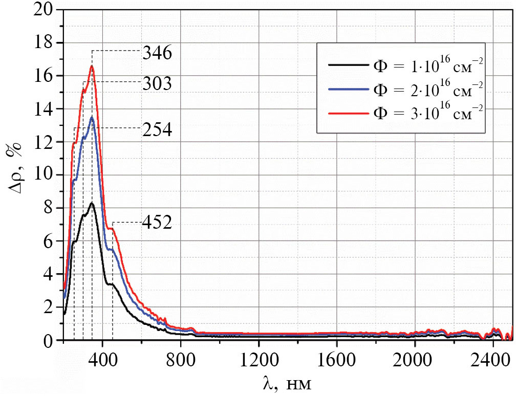 В разностных спектрах диффузного отражения (∆ρλ), получаемых вычитанием из спектра до облучения (ρλо) спектров после облучения образцов (ρλф) регистрируются полосы при 254, 303, 346 и 452 нм (рис. 3). Эти полосы являются полосами поглощения, наведенного облучением. Они определяются собственными радиационными дефектами, образованными в покрытии из Al2O3 при облучении. Такими дефектами могут быть: F22+-центры (452 нм –2.74 эВ), VAl′ (346 нм –3.58 эВ), Vo (303 нм –4.09 эВ), Ali (254 нм –4.88 эВ), описанные в работах [13–17]. При ионизационном механизме [18] при облучении электронами с энергией 30 кэВ в обеих подрешетках оксида алюминия образуются вакансии алюминия и кислорода и междоузельные ионы в различном зарядовом состоянии. Наиболее интенсивными являются полосы поглощения вакансий алюминия и кислорода.