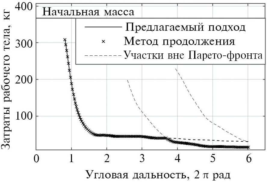 Части нескольких семейств решений, обеспечивающие для фиксированного времени полета минимум затрат топлива, можно объединить в Парето-фронт в координатах фиктивное время — затраты топлива. Вместо фиктивного времени более наглядно ввести угловую дальность перелета, скажем, в терминах изменения эксцентрической аномалии. На рис. 1 представлено сравнение решений, получаемых двумя подходами, в координатах угловая дальность — затраты топлива. Для сохранения представления о поведении семейств решений на графике оставлены и те их участки, которые не принадлежат Парето-фронту; они показаны штриховыми линиями. Сплошной линией обозначены решения, полученные методом внутренней точки и образующие Парето-фронт, а крестиками — решения, полученные стандартным методом продолжения в декартовых координатах.