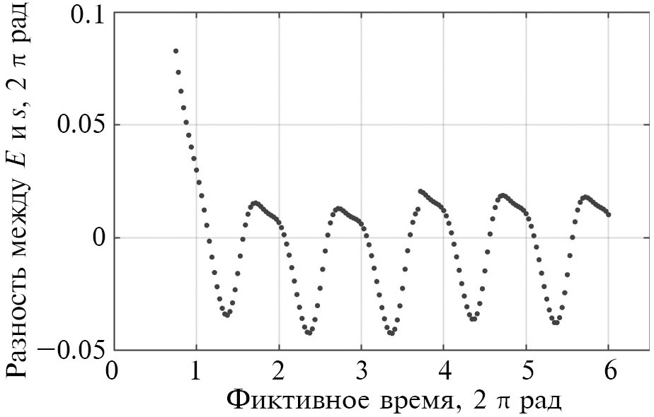 Среднее значение разницы в затратах топлива составляет 10–6 кг, а среднее расстояние между траекториями равно 90 км. Такой результат показывает хорошее совпадение между решениями, полученными разными методами. Заметим, что значения угловой дальности перелета (изменения эксцентрической аномалии) оказываются очень близкими к значениям длительности перелета в фиктивном времени. На рис. 2 показана их разность в точках Парето-фронта.