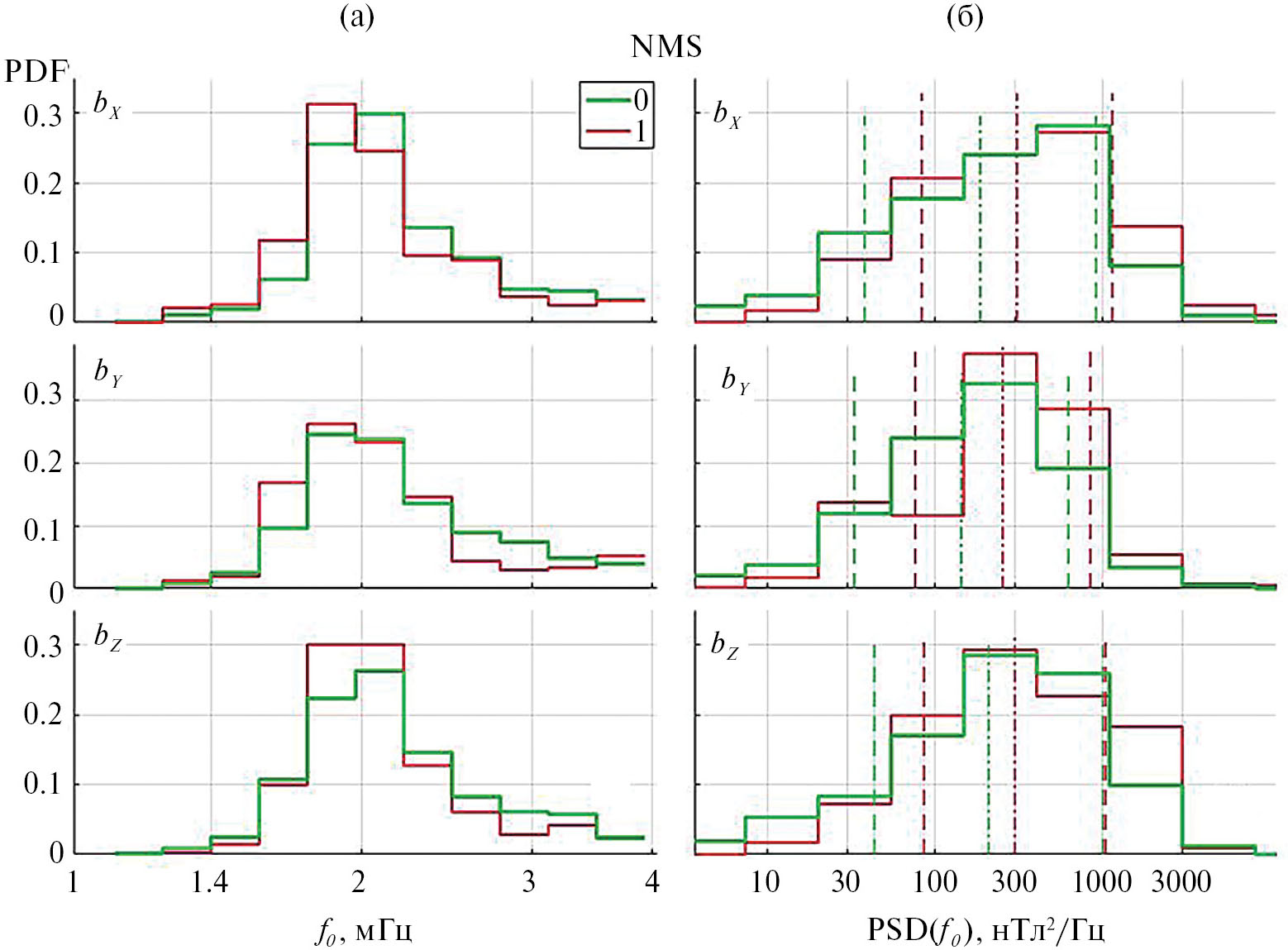 Рис. 1. Распределение по частотам главных спектральных максимумов f0 (панель а) и спектральной плотности мощности PSD(f0) (панель б) для трех компонент магнитного поля в ночном магнитослое для групп интервалов 0 и 1. Вертикальными линиями на панели б показаны средние для каждого распределения PSDav (штрих–пунктир) и PSDav±STD(PSD), STD(PSD) – стандартное отклонение.