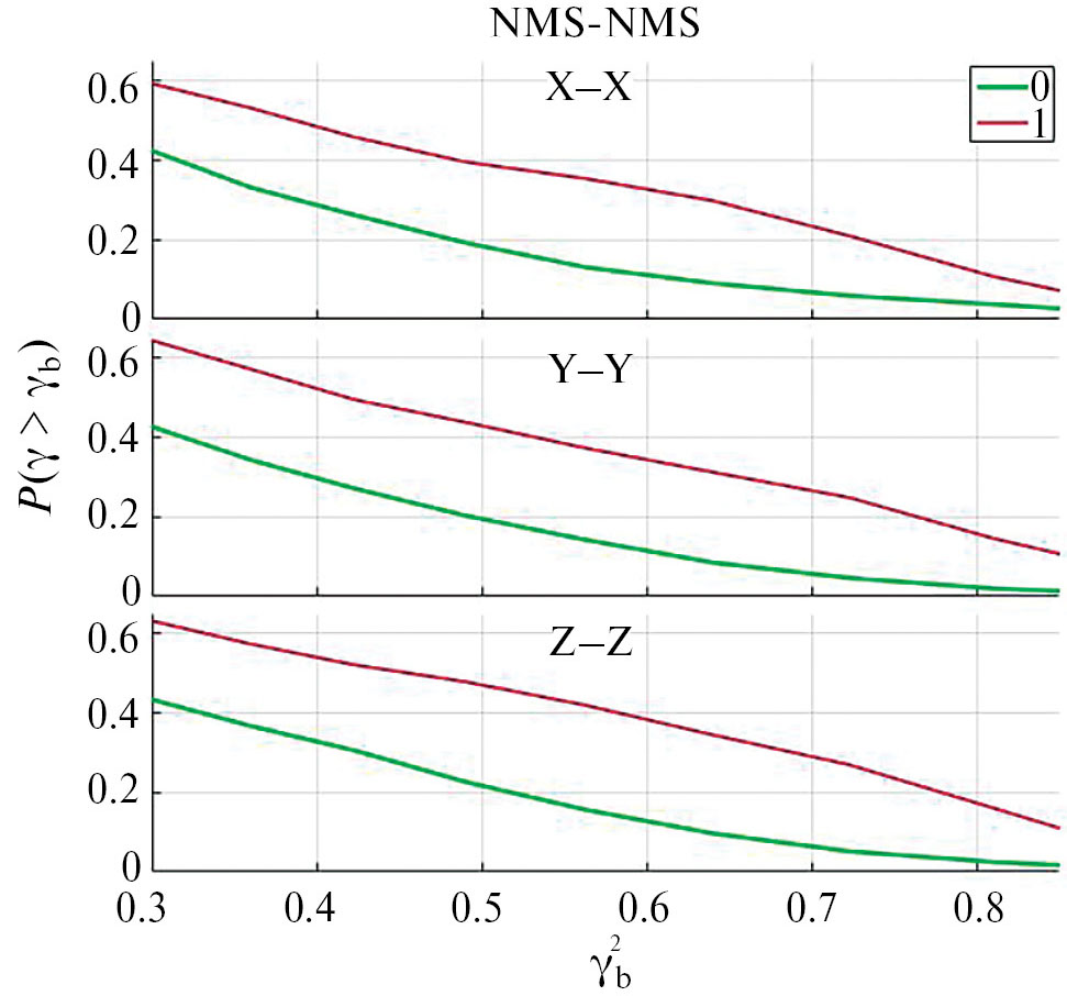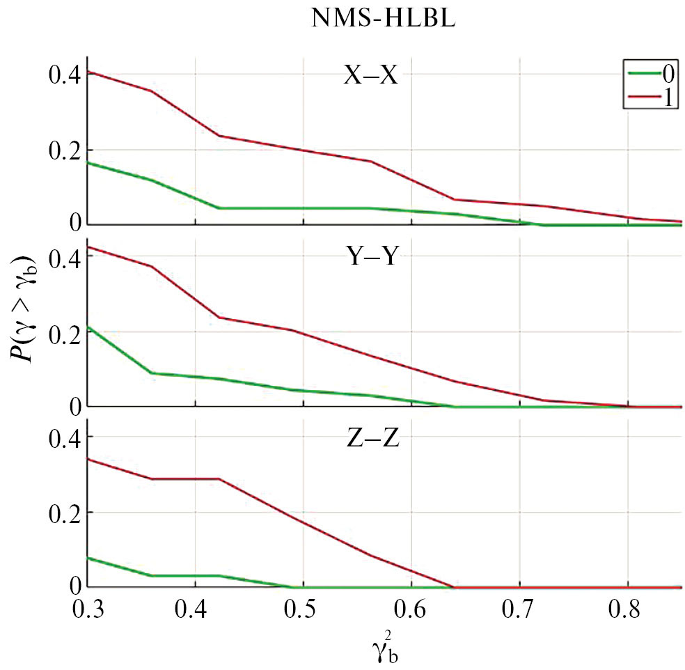 Рис. 2. Зависимость доли интервалов с надпороговой когерентностью вариаций магнитного поля на двух спутниках, расположенных по разные стороны магнитопаузы (NMS–HLBL) от порогового значения когерентности γb2 для одноименных компонент магнитного поля.